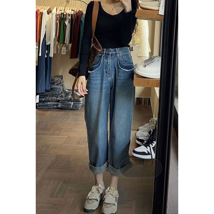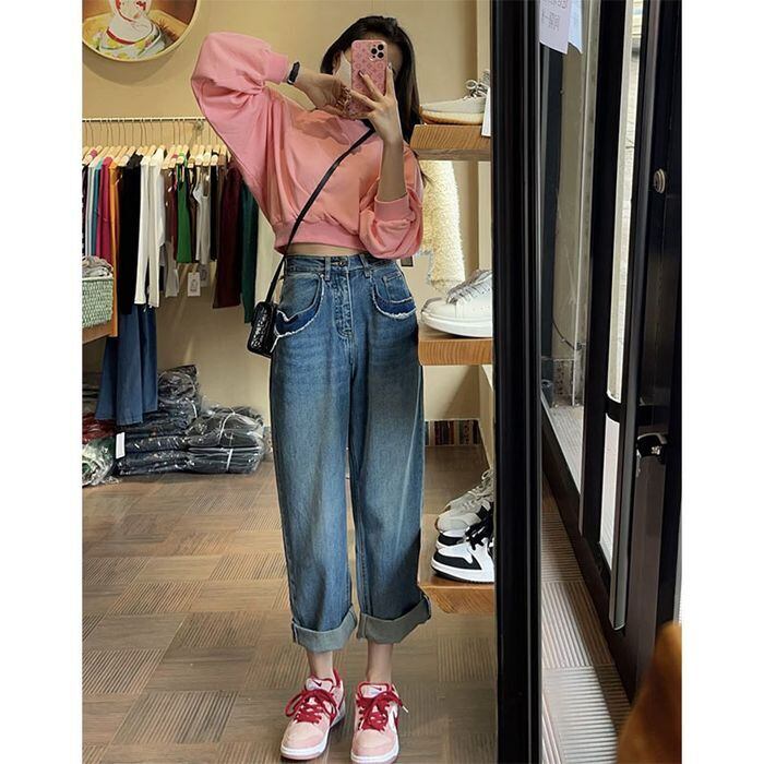 ボトムス パンツ ジーンズ ズボン クロップドパンツ 9分丈 ルーズ ゆったり ブルーデニム かわいい カジュアル おしゃれ お洒落 無地 春 夏 学生 通学 デート お出かけ 公園デビュー 女子会 着回し 普段使い S M L XL 2XL 3XL 4XL 青 ブルー 大きめサイズ