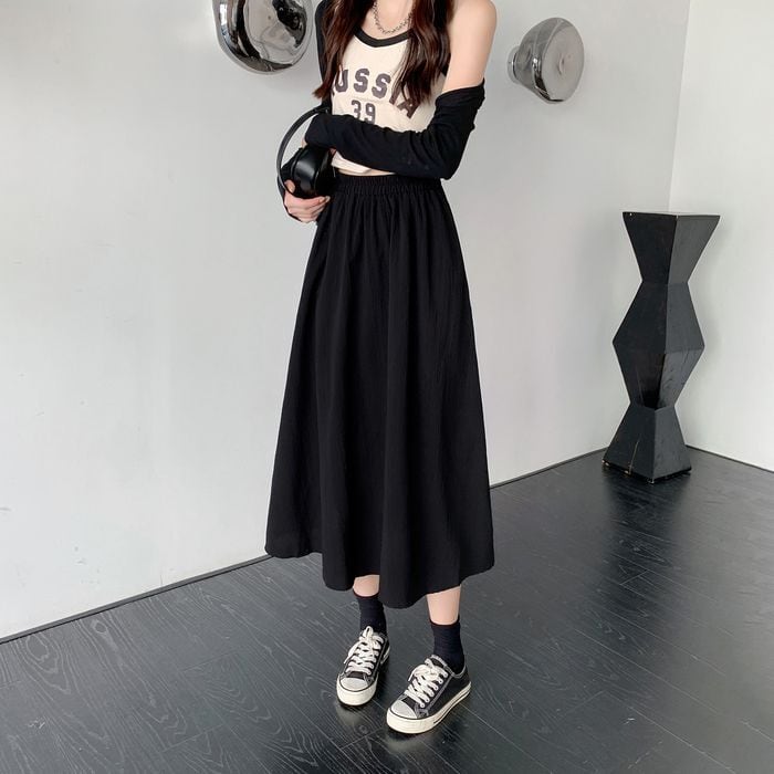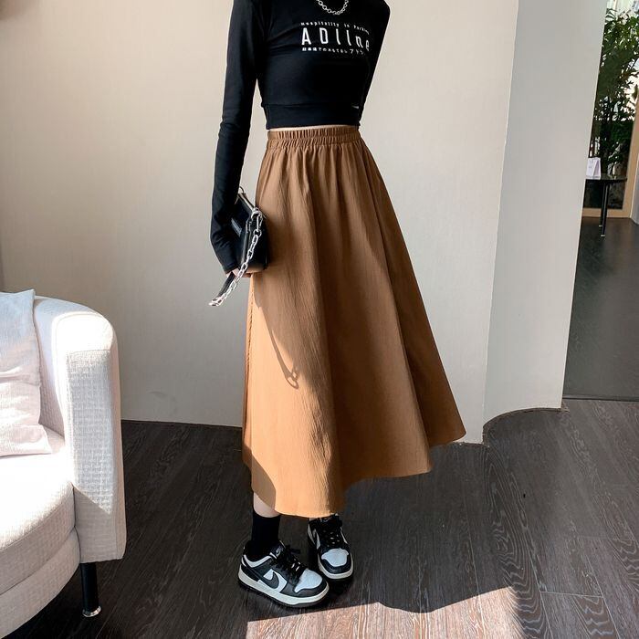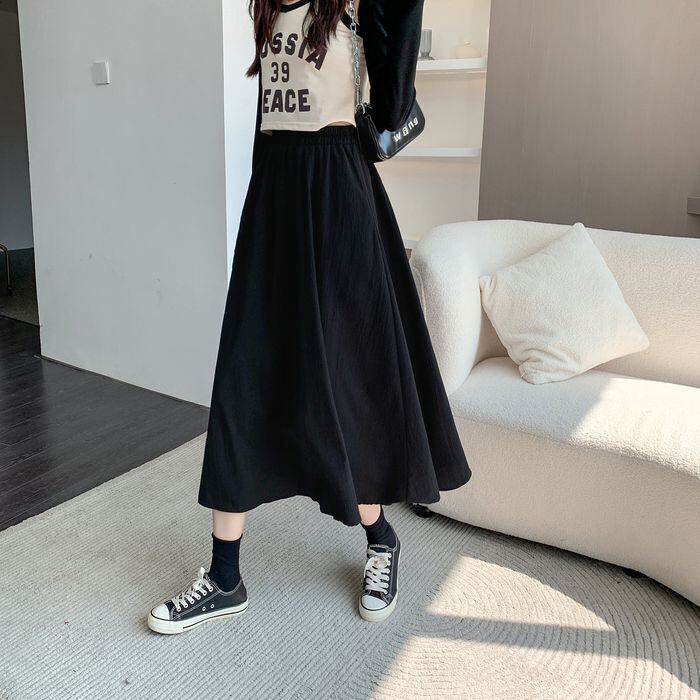 Aラインシルエットのミモレ丈スカート。