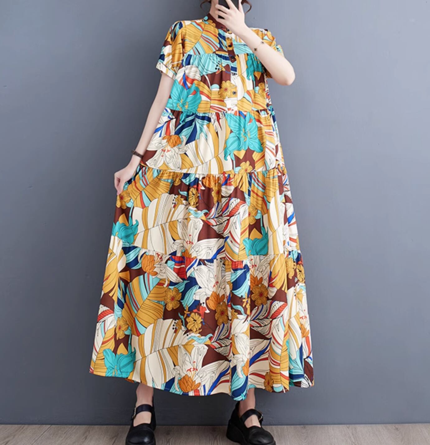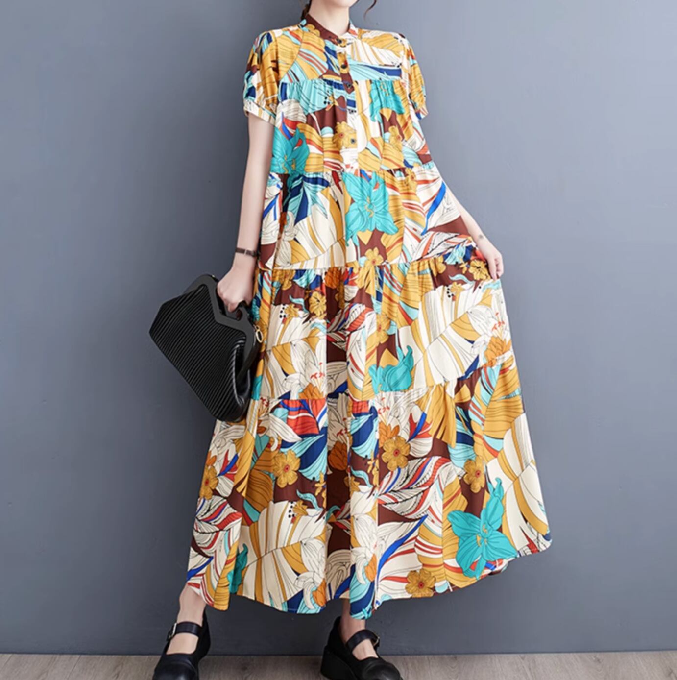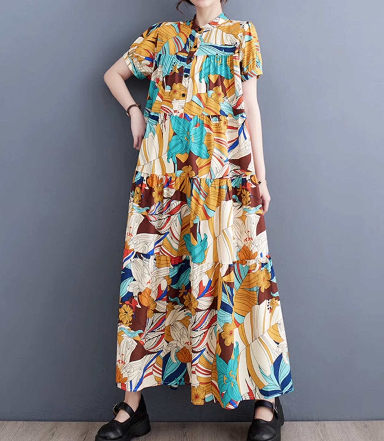 インパクトのある総柄が個性的!ゆったり着られて体型カバーも◎シフォン素材で上品さもプラスされたロング丈ワンピースです。