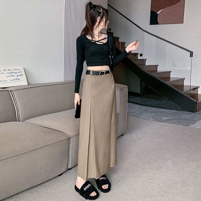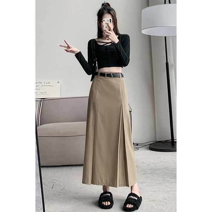 サイドにプリーツの入ったベルト付スカート。