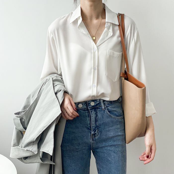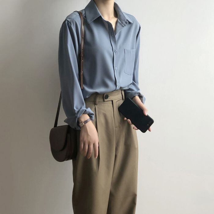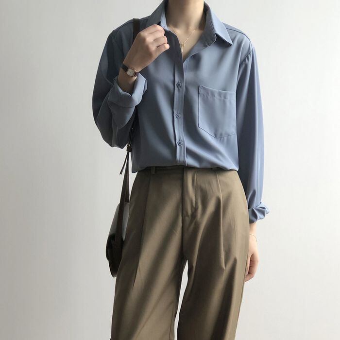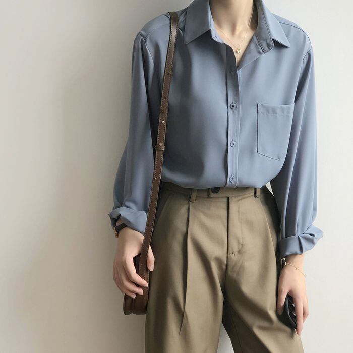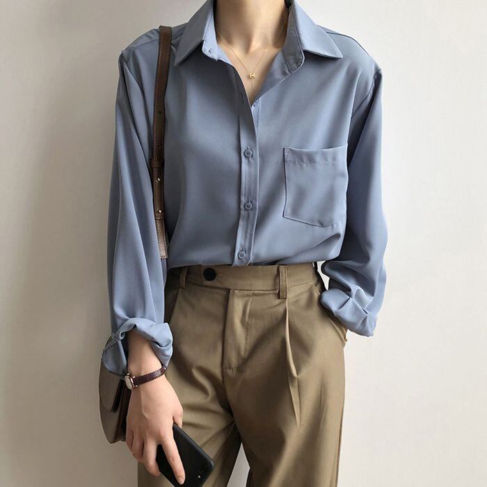 トップス シャツ ブラウス 長袖 襟付き ポケット シフォン 大人可愛い シンプル カジュアル 大人 上品 おしゃれ かっこいい 大人女子 無地 春 秋 20代 30代 40代 レディース ママ オフィス ビジネス OL 通勤 通学 お出かけ 休日 デート イベント 女子会 着回し 普段使い 韓国系 ファッション スタイル ゆったり 着痩せ 体系カバー 楽ちん 清潔感 S M L ブルー ホワイト ブラック