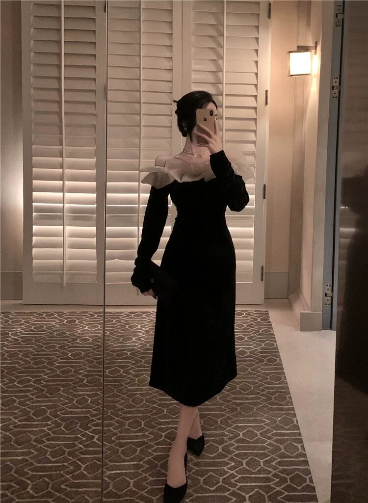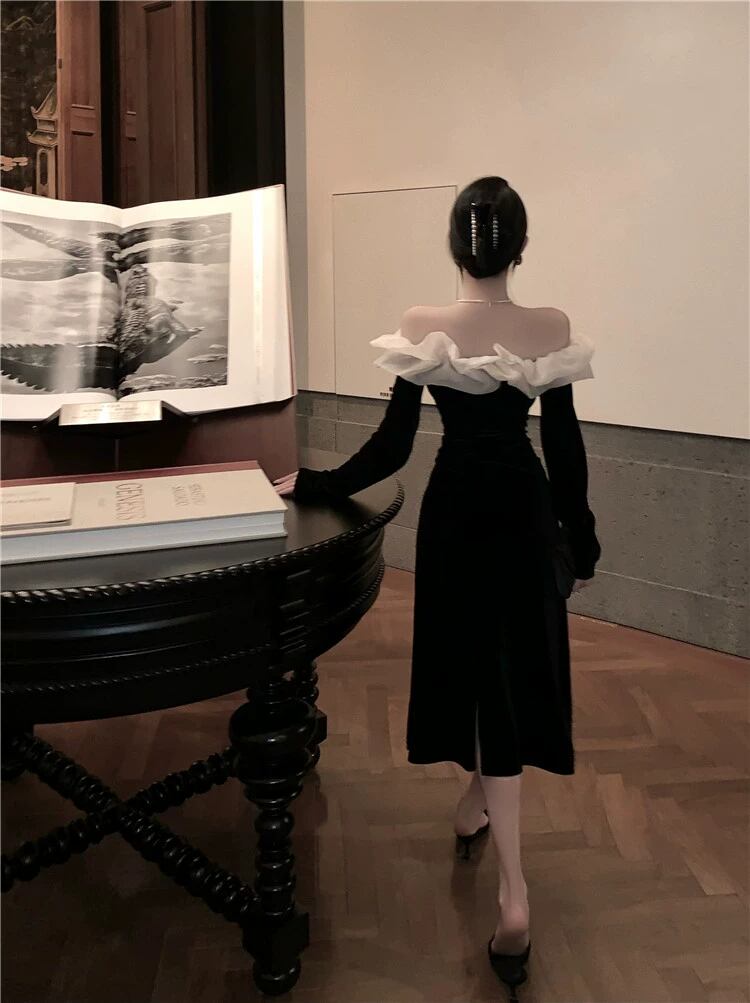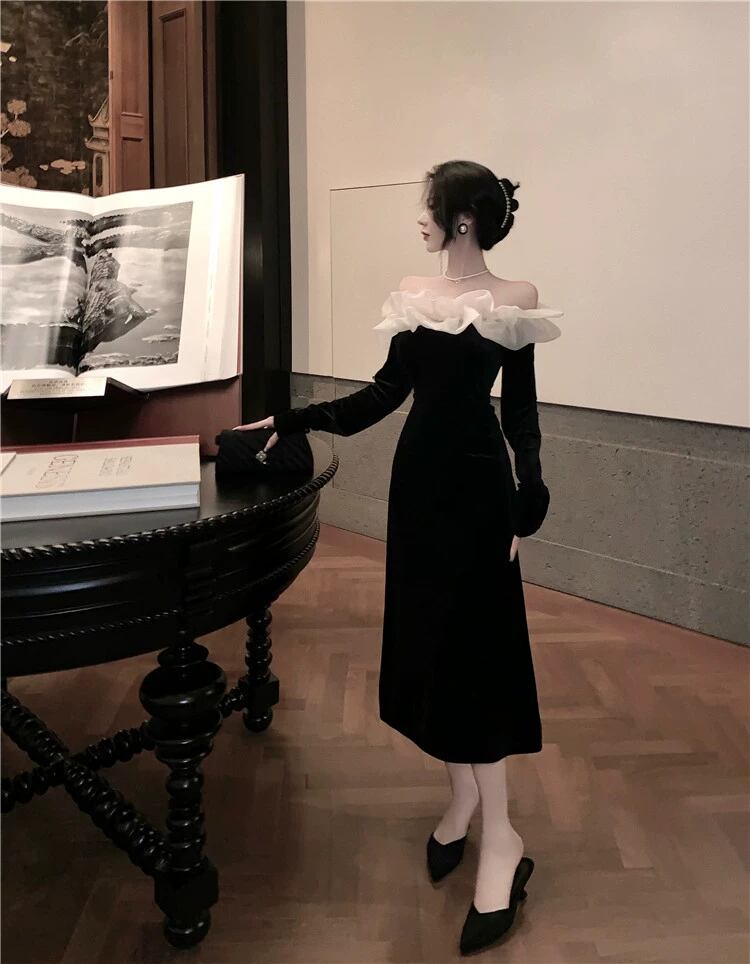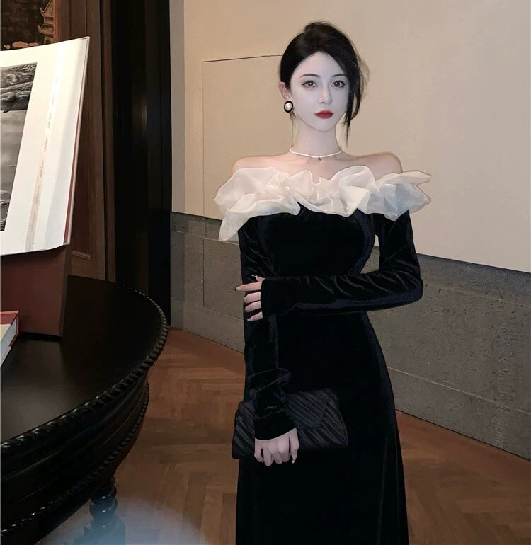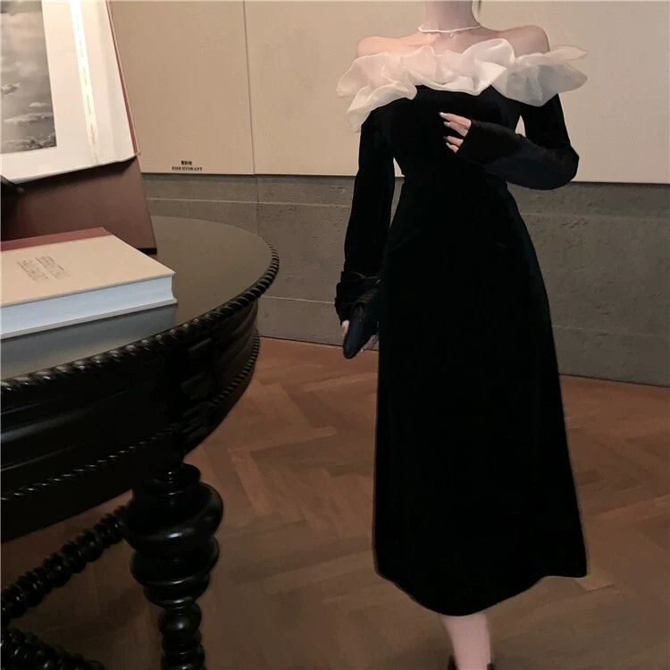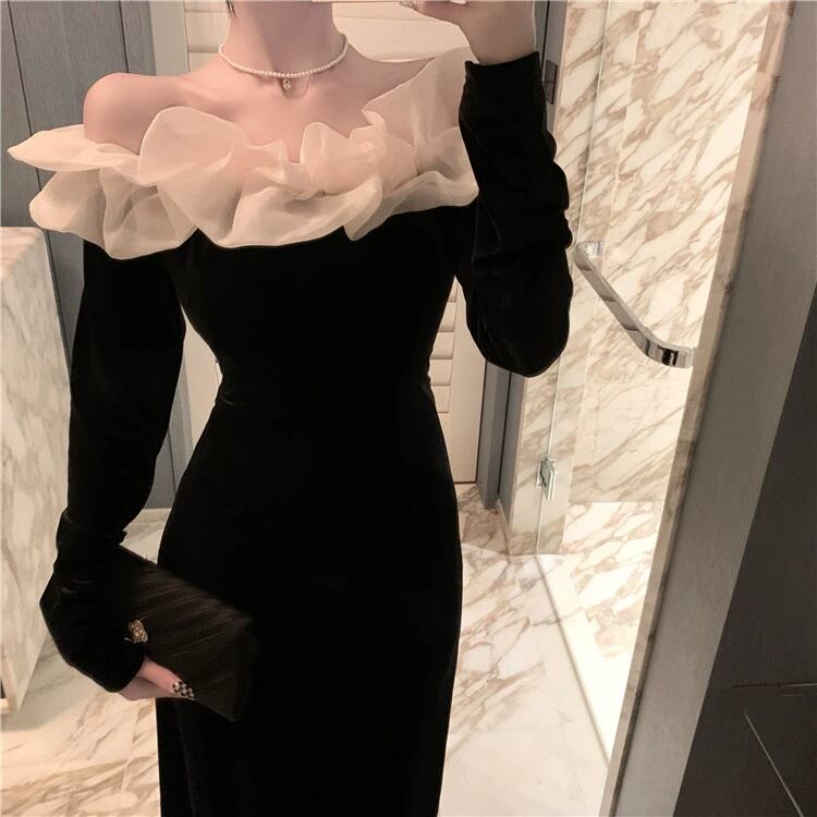 個性的 ワンピース フレアワンピース ワンピドレス ミモレ ミモレ丈 ミディアム丈 袖あり 長袖 オフショルダー オフショル 襟なし 細身 ドッキング シフォン フリル リボン ウエストマーク ハイウエスト かわいい 大人可愛い きれいめ シンプル カジュアル 大人 上品 おしゃれ お洒落 レトロ 大人女子 こなれ感 キュート クール モード系 エレガント モダン 主役級 存在感 抜け感 無地 春 秋 10代 20代 30代 パーティー イベント 韓国 モテ 美脚 インスタ映え S M ホワイト 黒