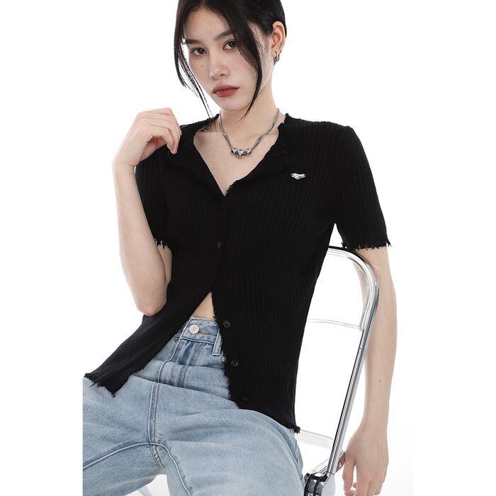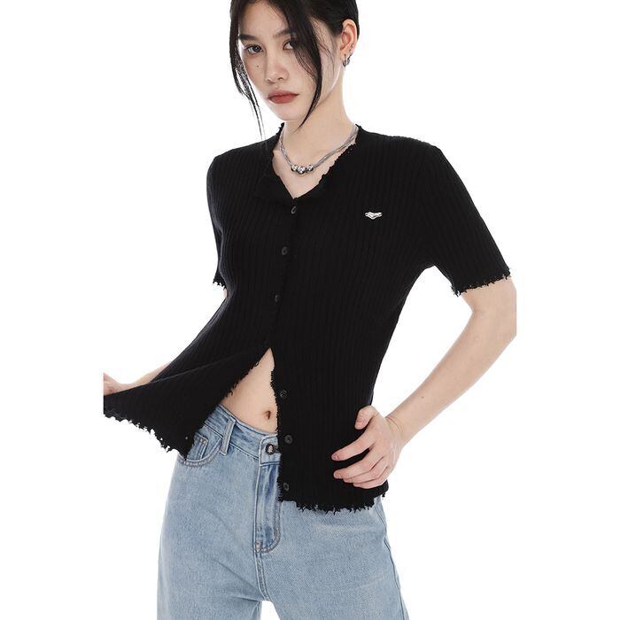 トップス カーディガン 袖あり 半袖 Vネック 無地 リブニット 前開き キュート かわいい ラブリー 大人可愛い 大人っぽい 大人女子 フェミニン きれいめ エレガント 上品 清潔感 ベーシック カジュアル こなれ感 ラフ レトロ プレッピー クラシカル 抜け感 おしゃれ お洒落 華やか 存在感 無地 春 夏 秋 レディース 女性用 通学 学生 お出かけ デート 普段使い デイリー 着回し 楽ちん 重ね着 定番 暖かい ダメージ加工 カットオフ ブラック S M L