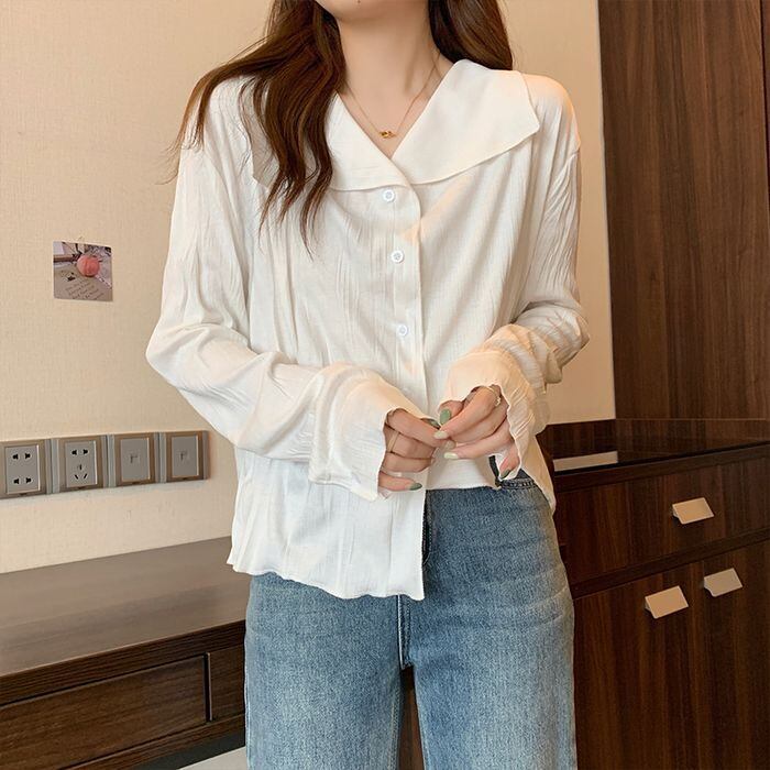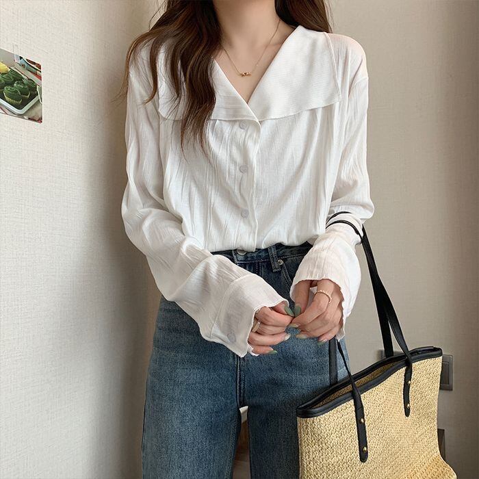 トップス シャツ ブラウス 長袖 襟付き シワ加工 大人可愛い シンプル カジュアル 大人 上品 おしゃれ かっこいい 大人女子 無地 春 秋 20代 30代 40代 レディース ママ オフィス ビジネス OL 通勤 通学 お出かけ 休日 デート イベント 女子会 着回し 普段使い 韓国系 ファッション スタイル ゆったり 着痩せ 体系カバー 楽ちん 清潔感 L XL 2XL 3XL 4XL 大きいサイズ ホワイト