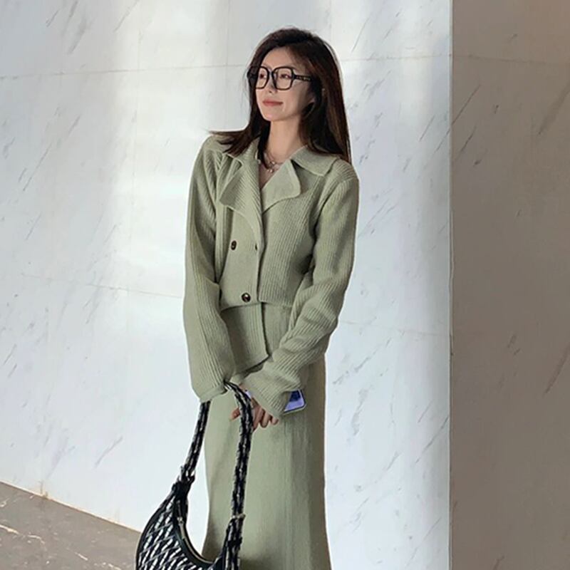 個性的 レディース スーツ ツーピース トップス スカート セットアップ ロングスカート ロング丈 袖あり 長袖 前開き ニット サマーニット 上下セット 大人可愛い きれいめ シンプル 大人 おしゃれ お洒落 かっこいい 大人可愛い 大人女子 こなれ感 ラブリー セクシー 存在感 無地 春 秋 冬 20代 30代 女性用 ビジネス 女子会 お泊まり イベント ガーデン レストラン 着回し 普段使い 重ね着 韓国系 ファッション スタイル 体系カバー インスタ映え S M L XL 緑 グリーン