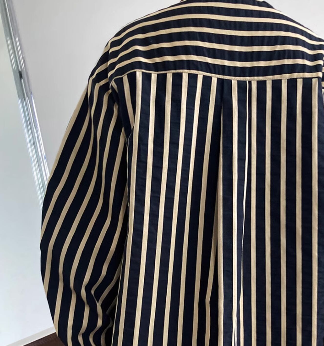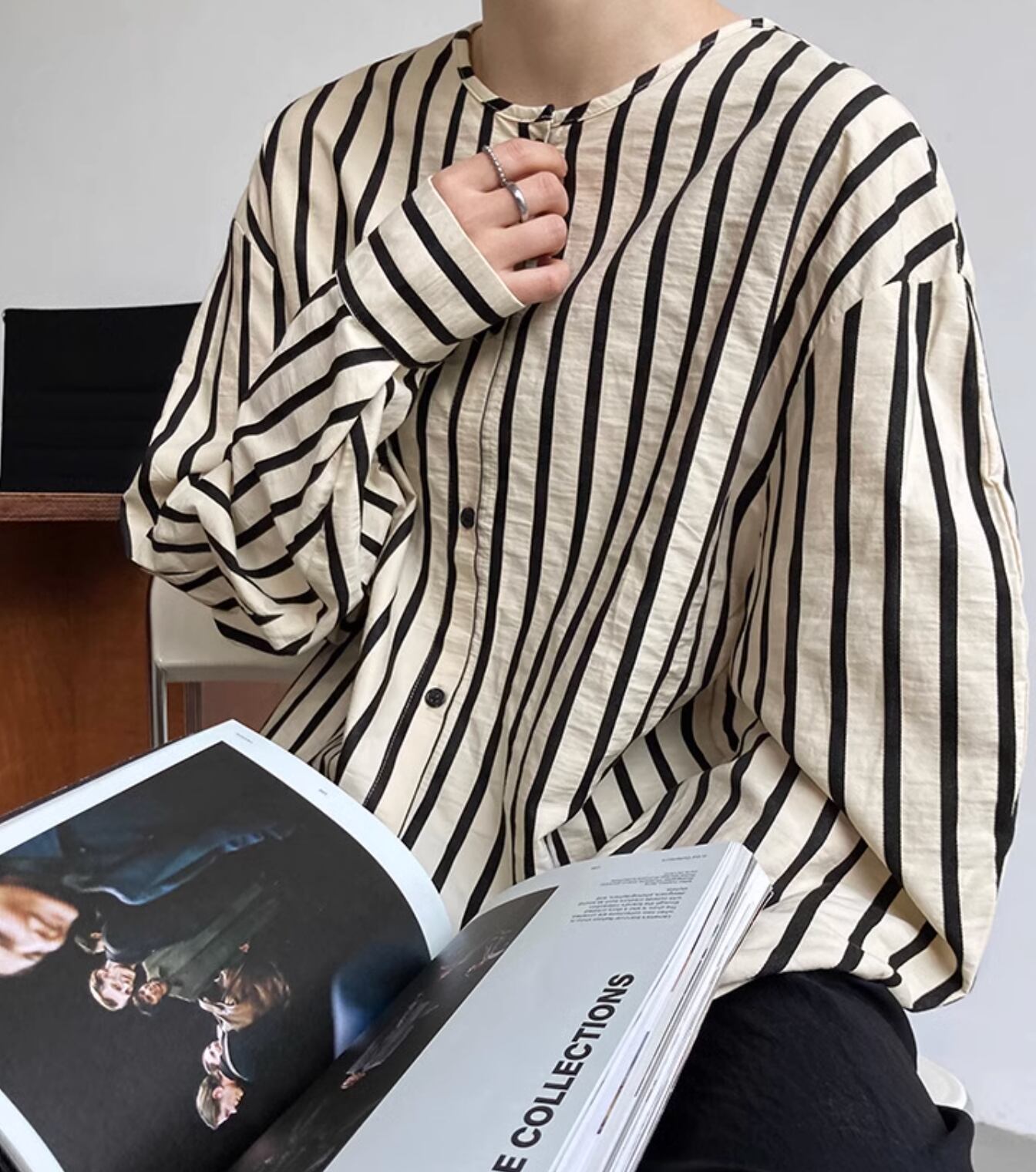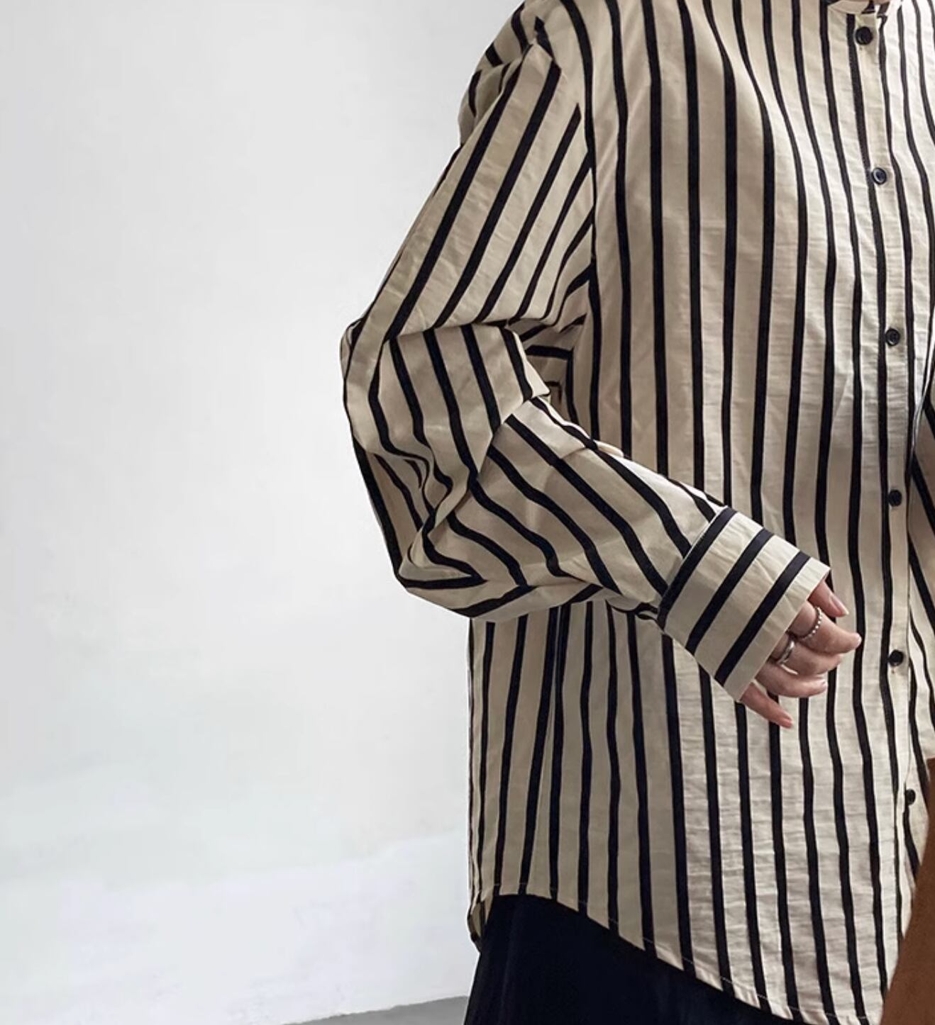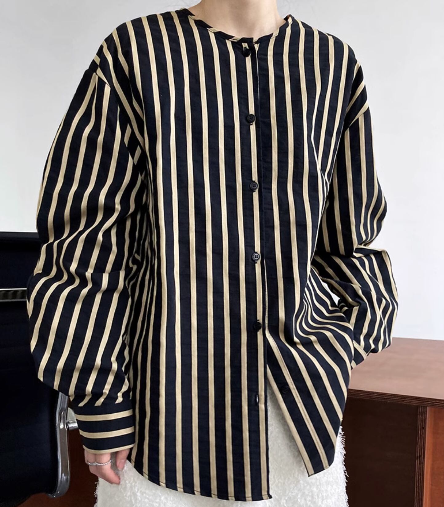 ふんわり袖が可愛いゆったりノーカラーシャツです。