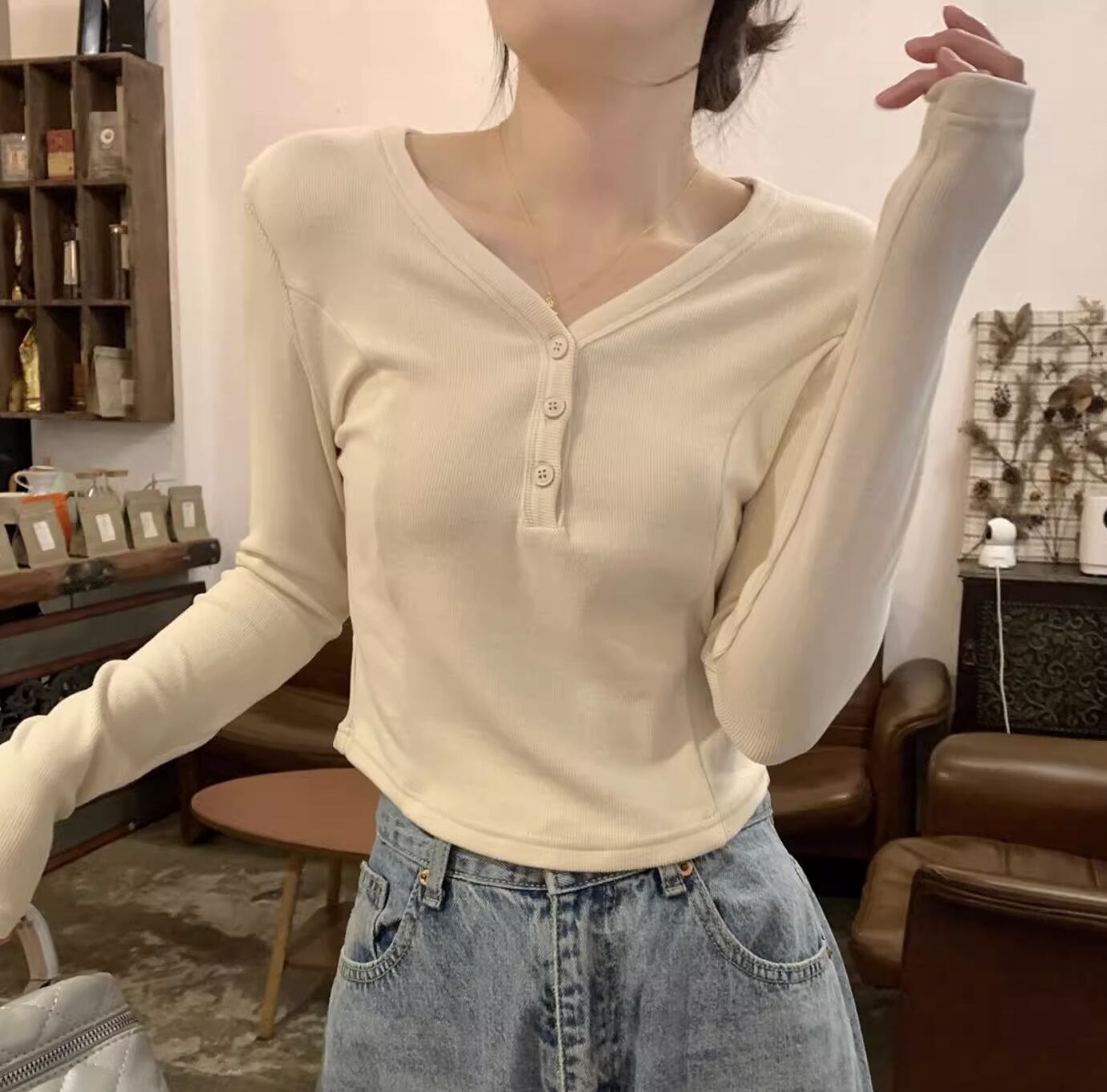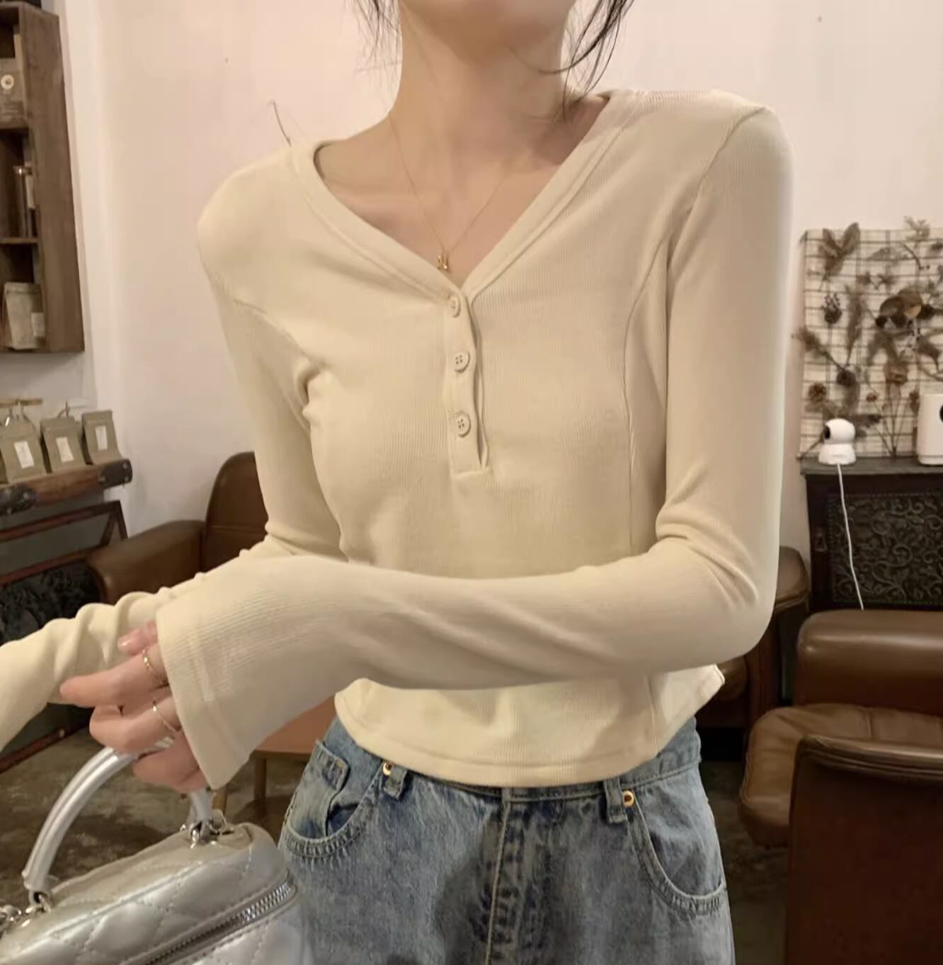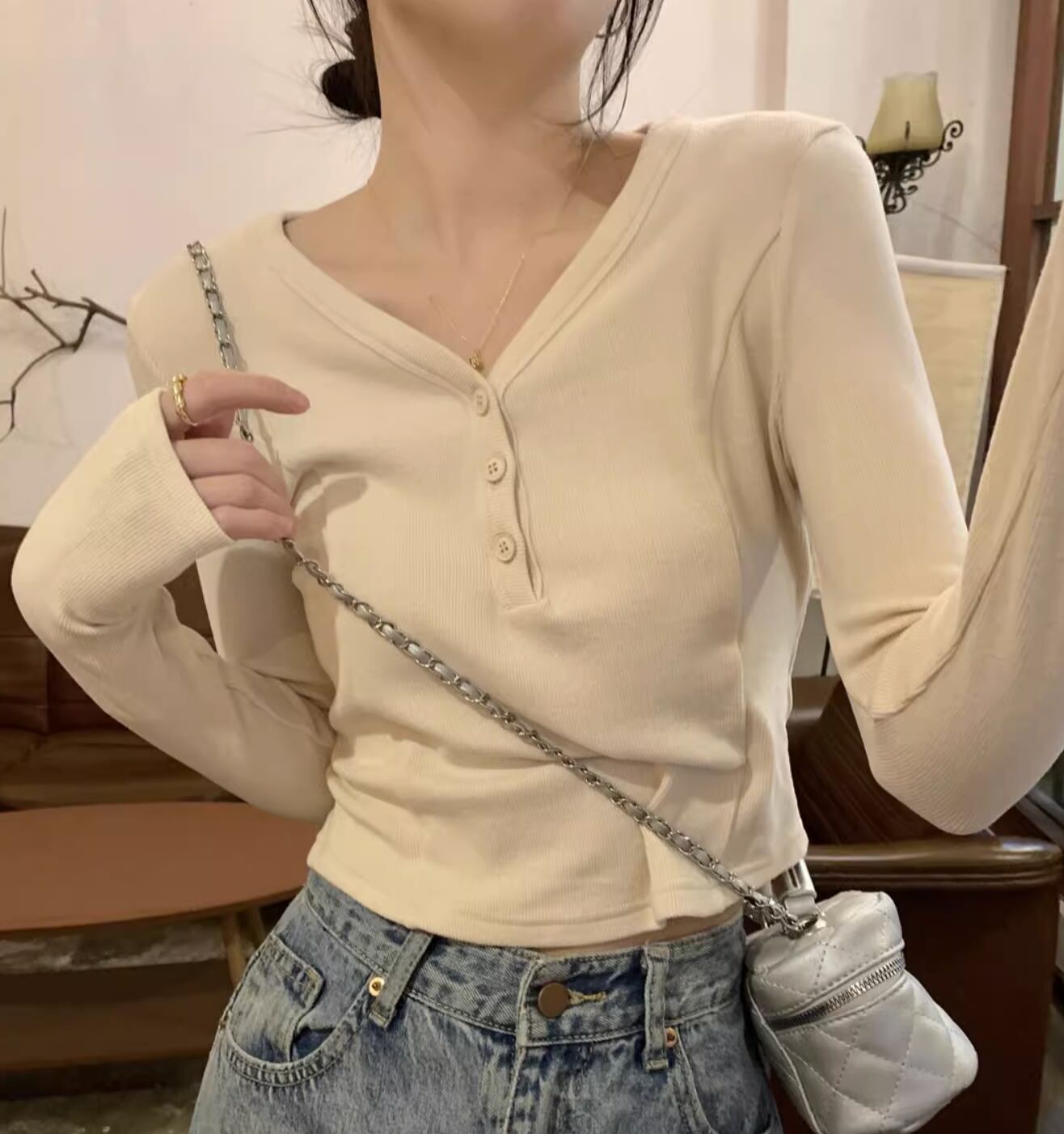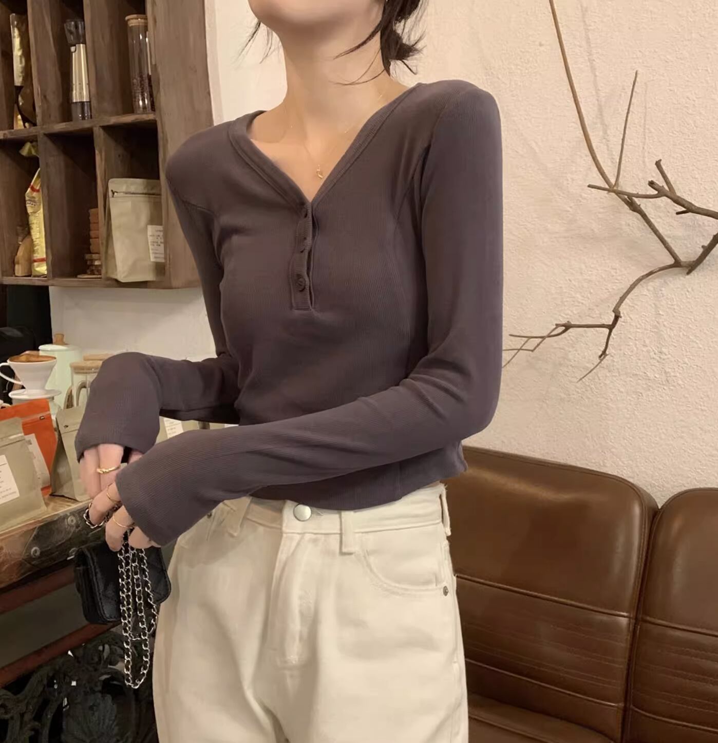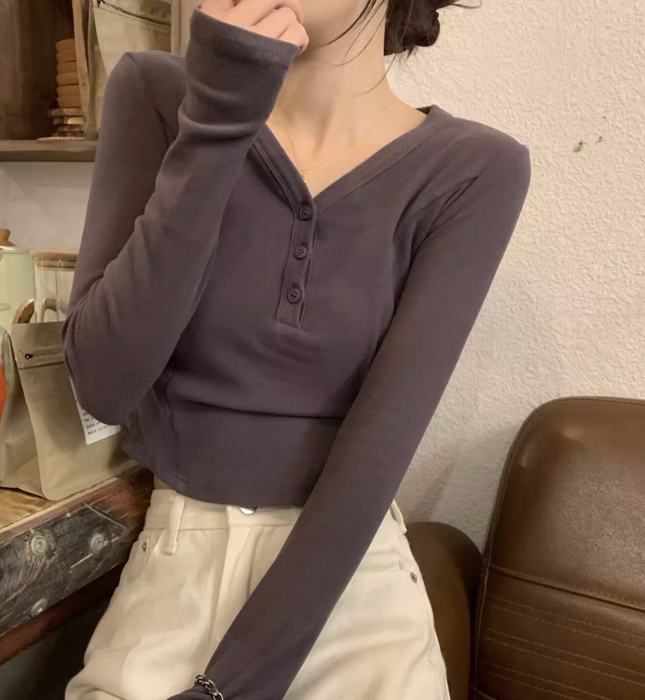 レディース トップス カットソー プルオーバー ショート ショート丈 長袖 Vネック タイト スリム 細身 アメカジ ボタン かわいい 大人可愛い きれいめ シンプル カジュアル 上品 おしゃれ レトロ ラフ ガーリー クール 抜け感 ラブリー キュート アメリカン 無地 春 秋 学生 学校 通学 デート お出かけ 休日 ショッピング コンサート ライブ お花見 合コン コンパ フェス お揃い 双子 韓国 オルチャン コーデ 楽ちん プチプラ 普段使い 着回し モテ S M L グレー アプリコット 灰色