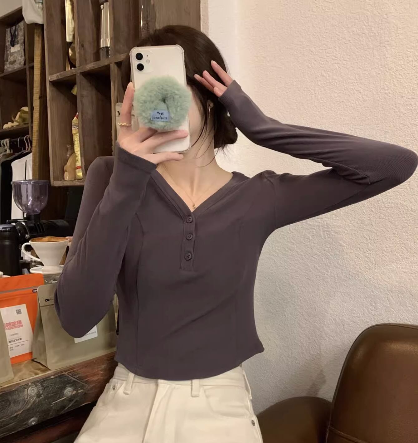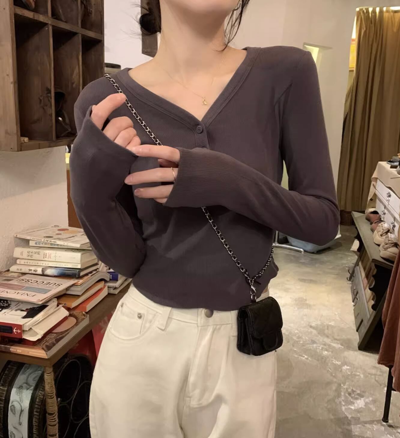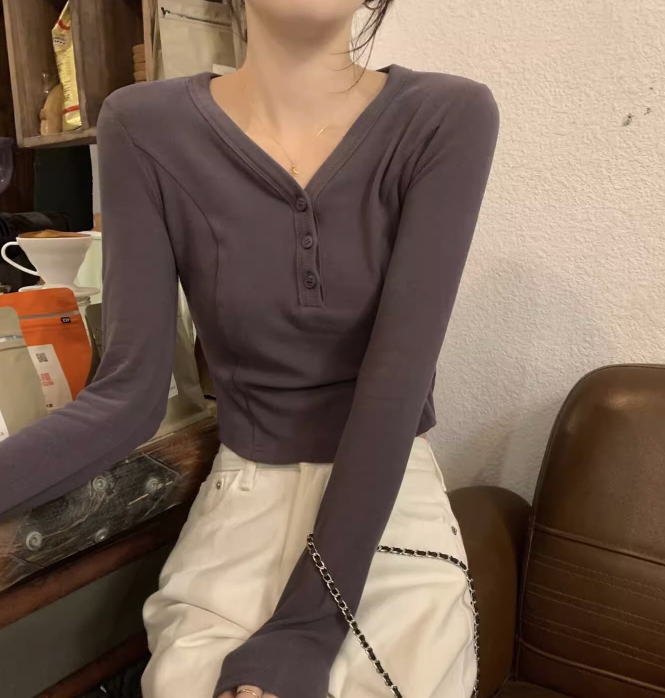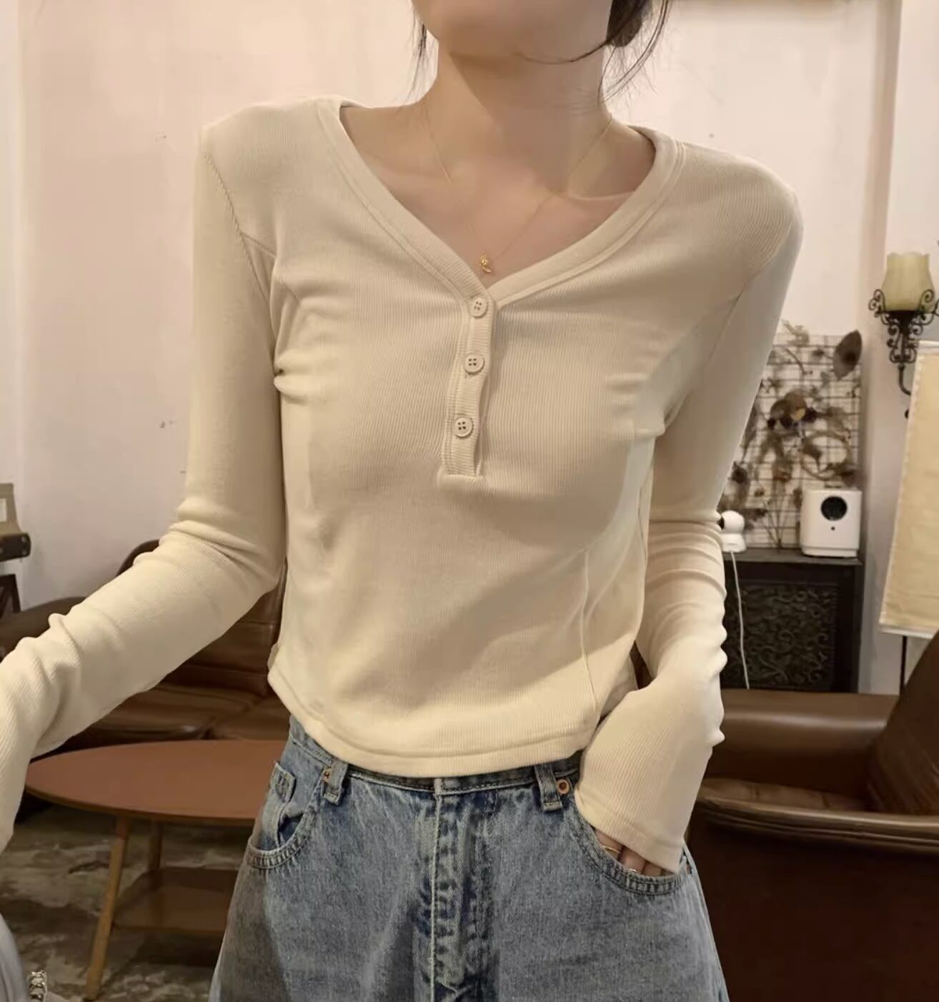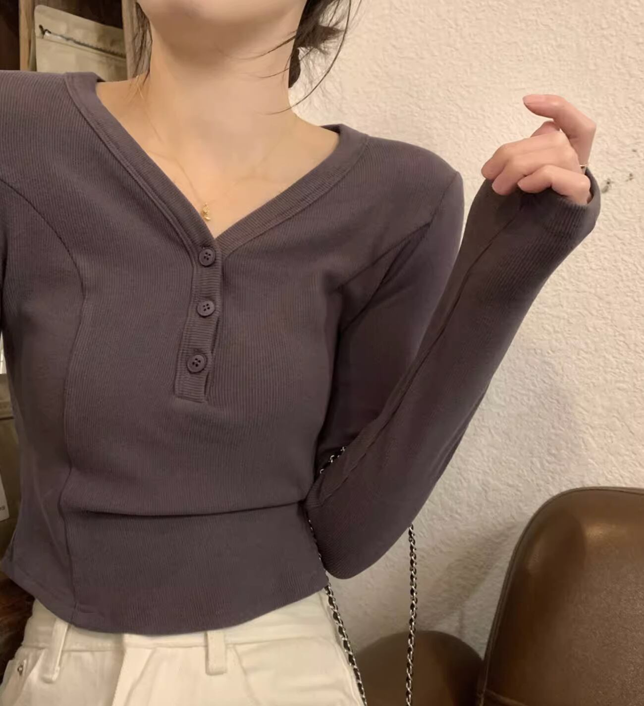 レディース トップス カットソー プルオーバー ショート ショート丈 長袖 Vネック タイト スリム 細身 アメカジ ボタン かわいい 大人可愛い きれいめ シンプル カジュアル 上品 おしゃれ レトロ ラフ ガーリー クール 抜け感 ラブリー キュート アメリカン 無地 春 秋 学生 学校 通学 デート お出かけ 休日 ショッピング コンサート ライブ お花見 合コン コンパ フェス お揃い 双子 韓国 オルチャン コーデ 楽ちん プチプラ 普段使い 着回し モテ S M L グレー アプリコット 灰色