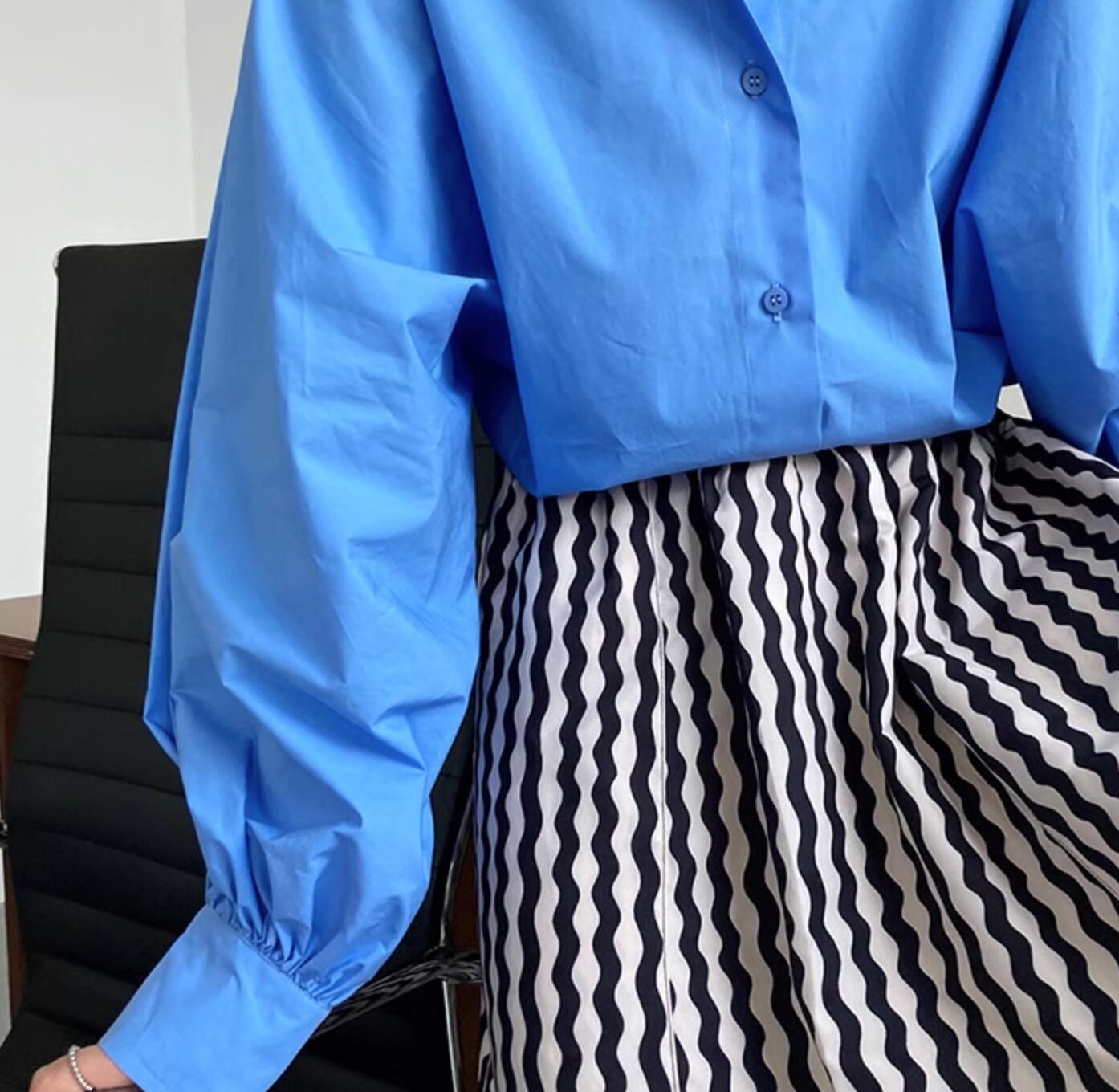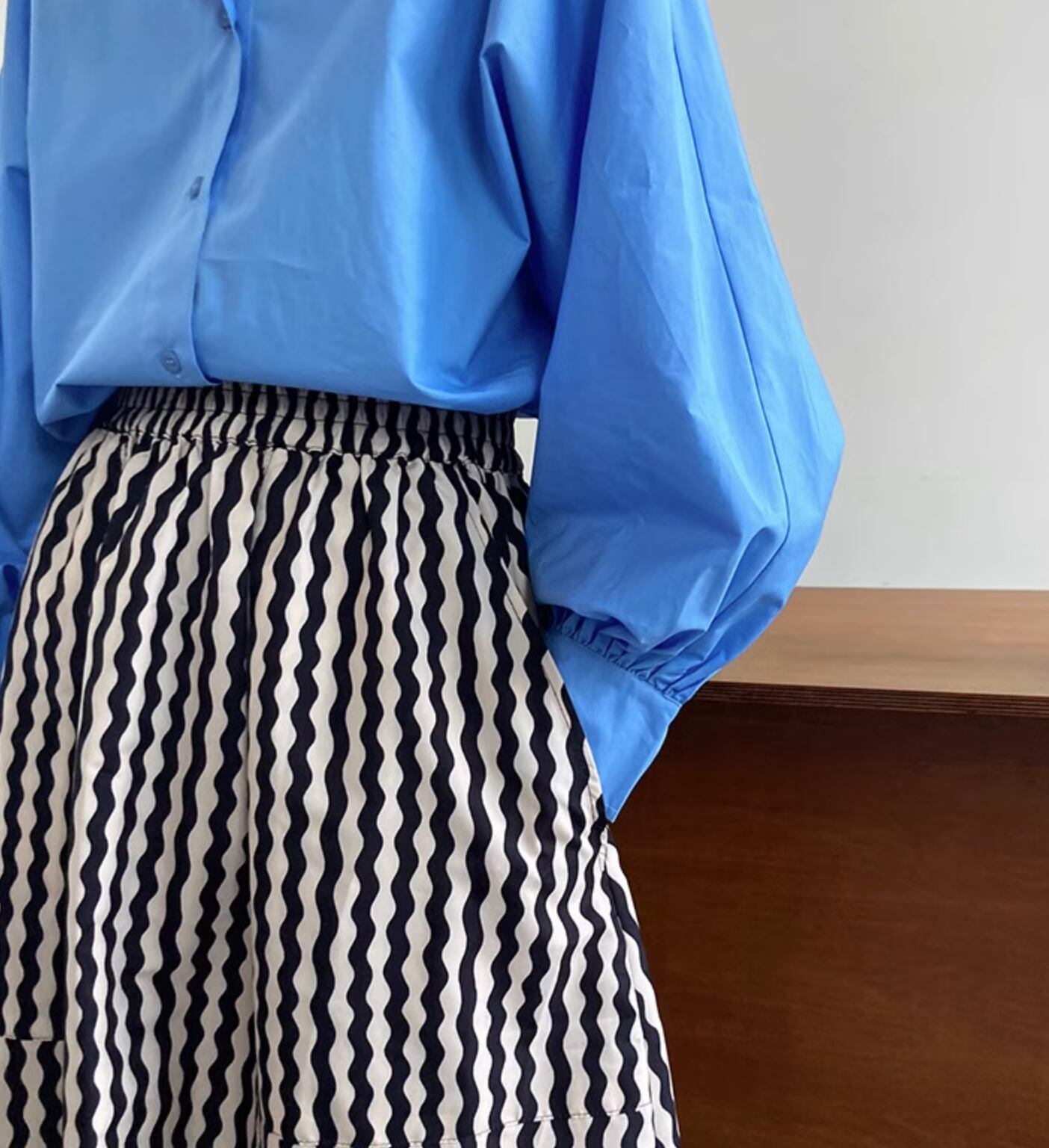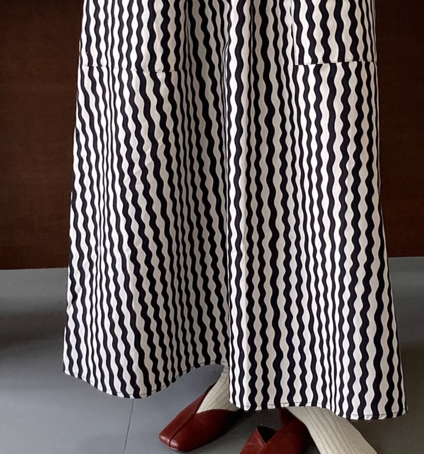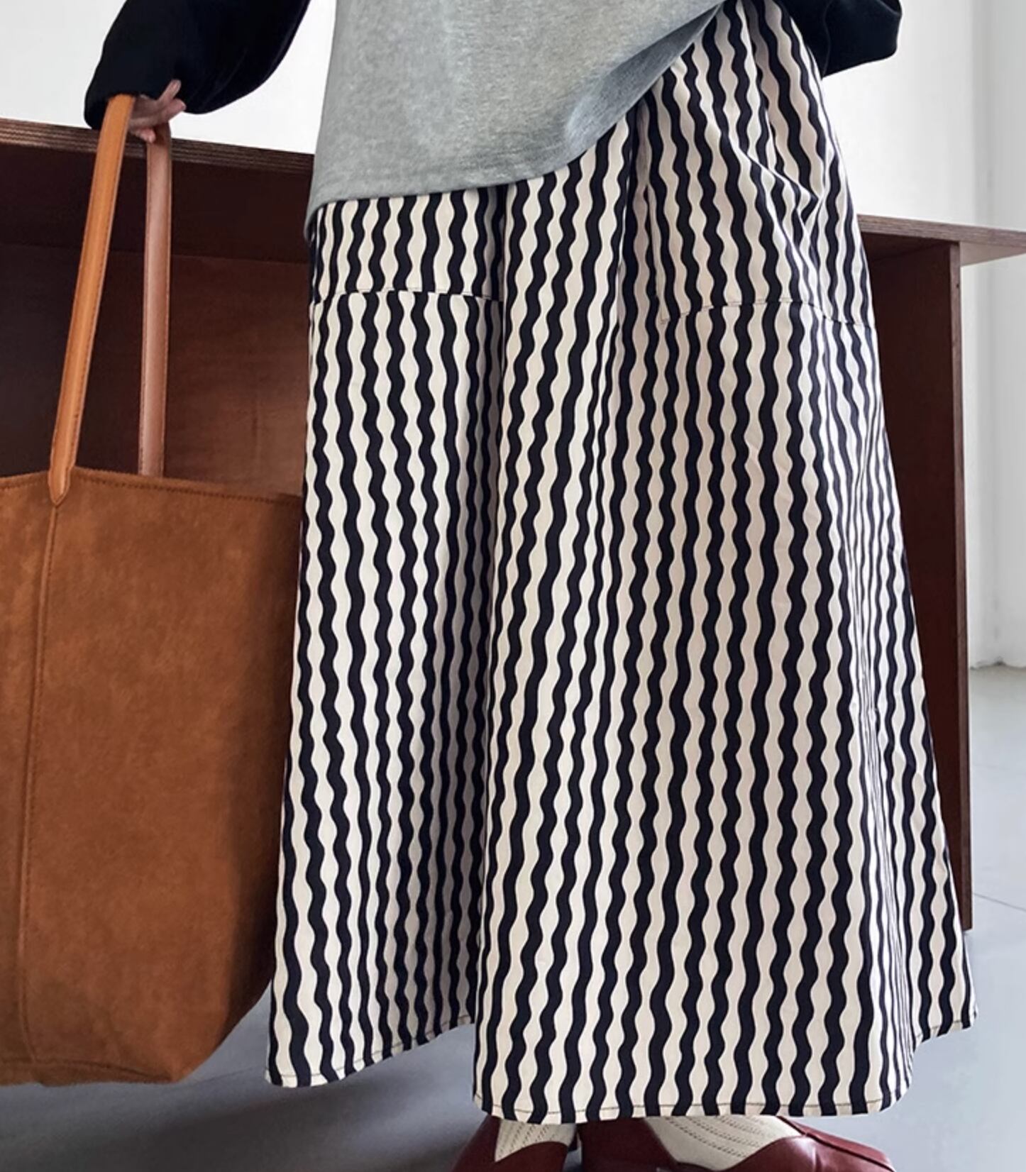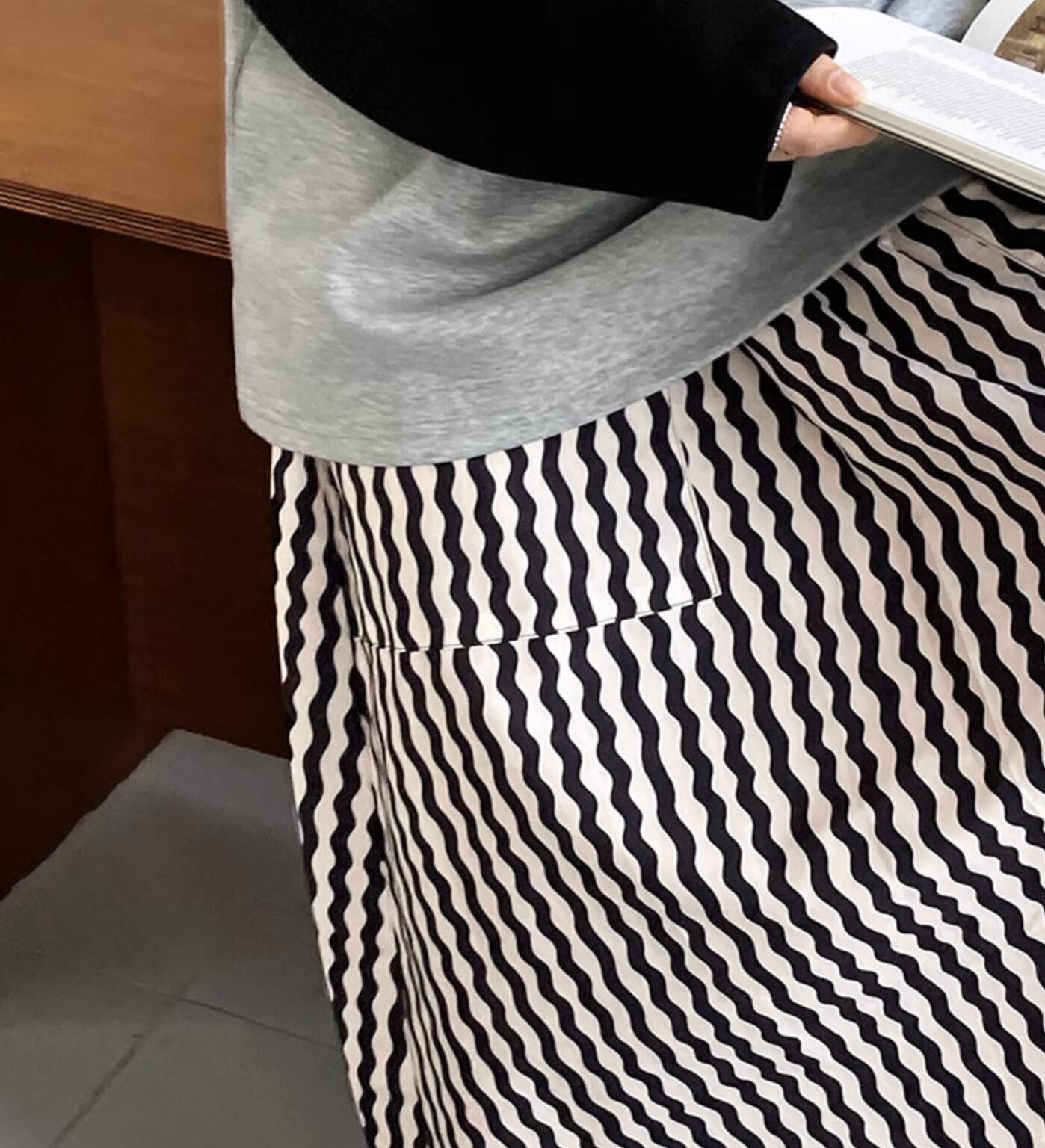 波状のストライプデザインでオシャレ度アップのロング丈スカートです。