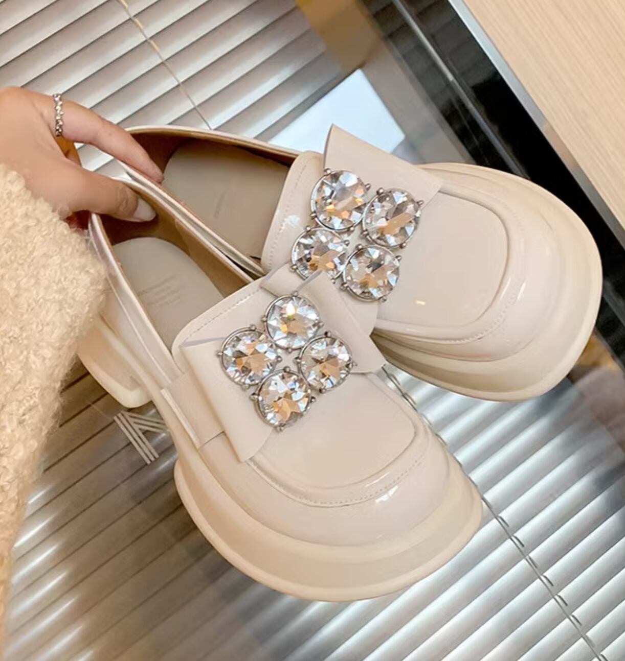 ラインストーンが輝く、女性らしいデザインのローファーです。