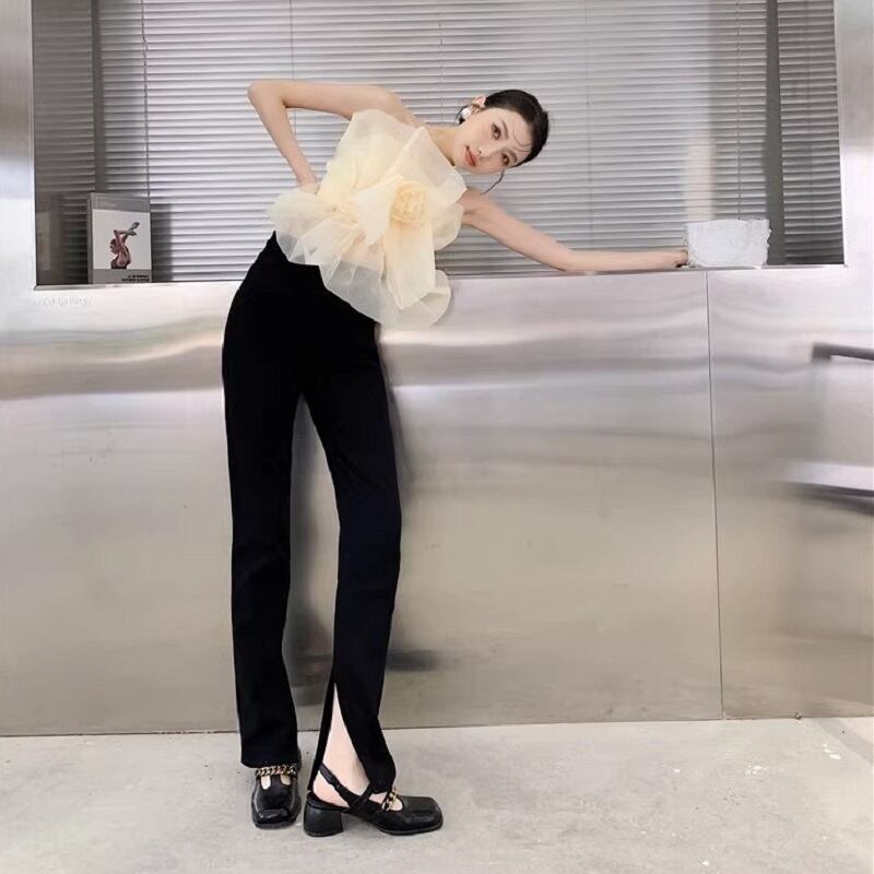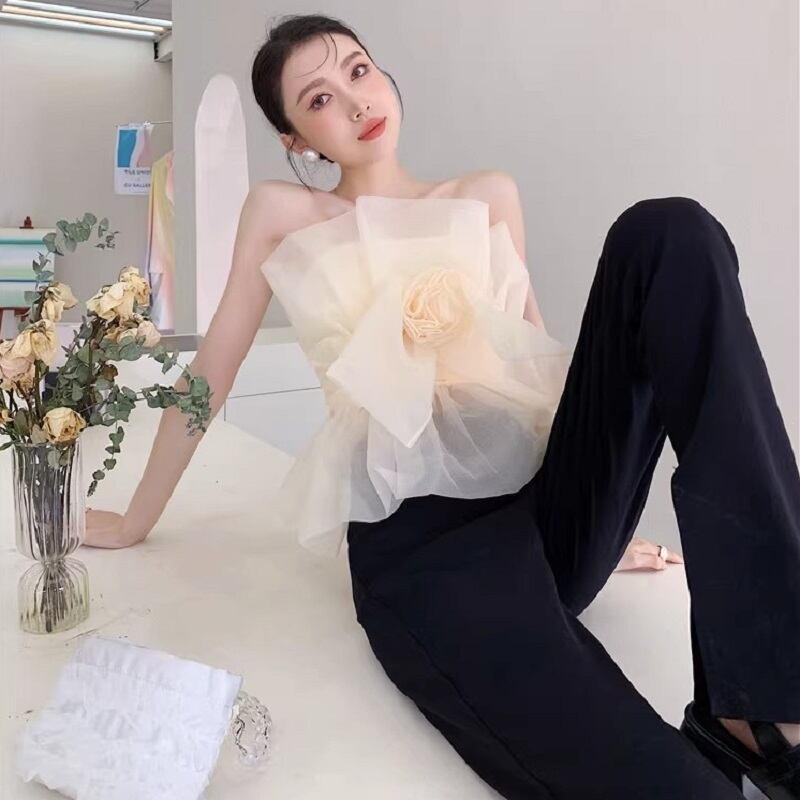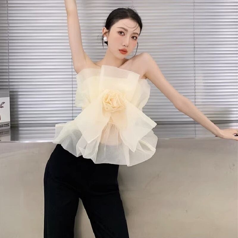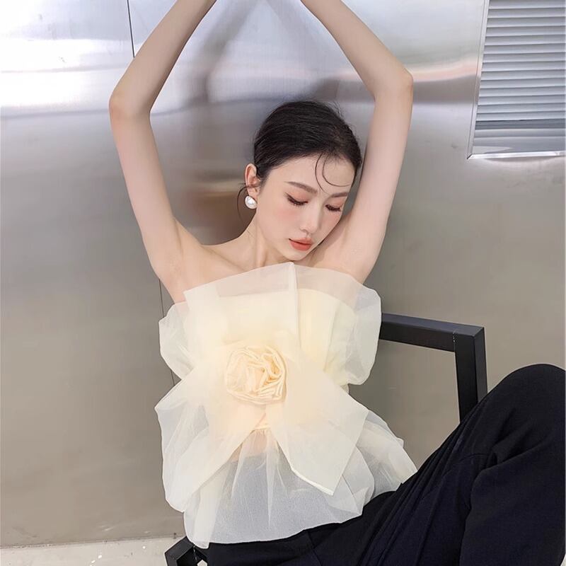 プルオーバータイプのトップスで、メッシュ素材を使用し、チューブトップデザインになっています。薄手で涼しげな素材感で、夏のカジュアルなスタイリングにぴったりです。シルエットはスリムで、チュール素材を使用したオープンショルダーデザインが、ガーリーでこなれた雰囲気を演出しています。さりげない主役級のデザインが個性的で、カジュアルからキュートなスタイリングまで幅広く楽しめます。