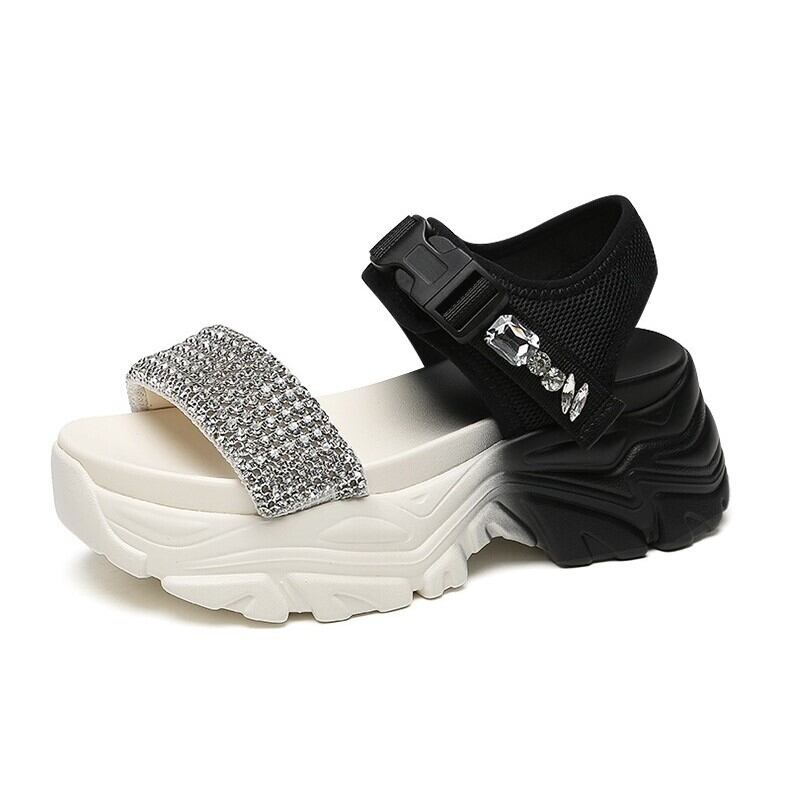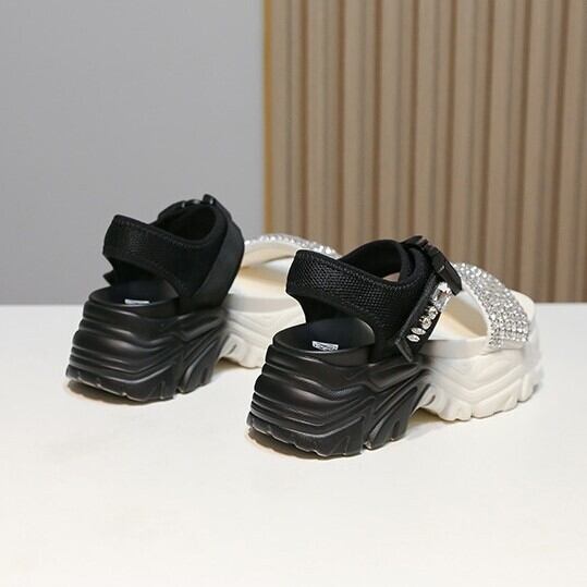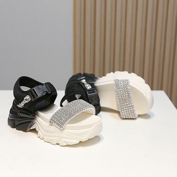 快適な履き心地が魅力の厚底サンダル。ラインストーンが輝くデザインは、カジュアルからハイヒールまで幅広いシーンで活躍します。春の訪れにぴったりのオープントゥとベルクロ仕様で、レジャーやデートにもぴったりです。