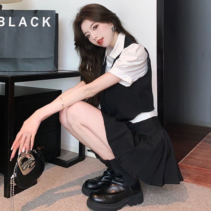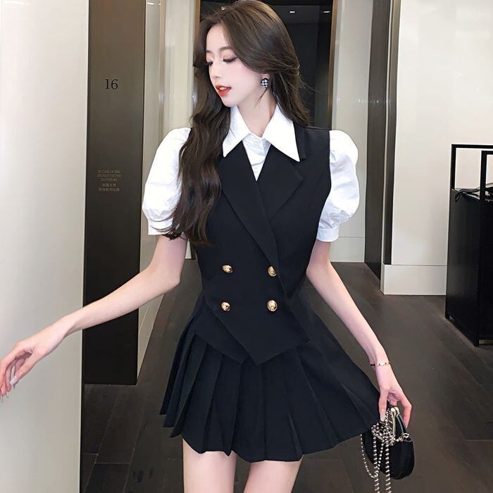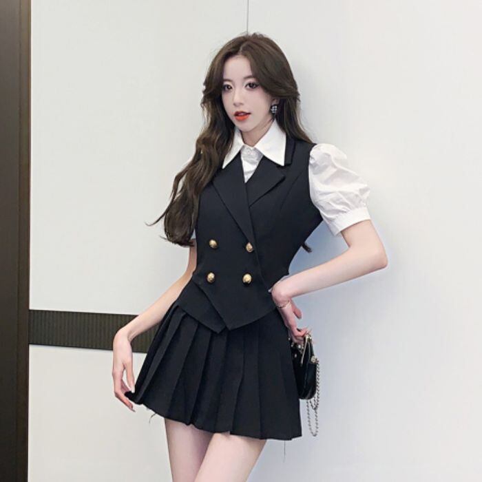 レディース セットアップ 3点セット ベスト スカート ブラウス ミニスカート ミニ ミニ丈 ショート ショート丈 セミフレア Aライン 細身 プリーツ かわいい カジュアル おしゃれ お洒落 ボーイッシュ スポーティー 主役級 存在感 無地 オールシーズン シーズンレス 入学式 卒業式 10代 20代 女性用 学生 通学 デート 着回し 普段使い 韓国 韓国系 ファッション 流行 インスタ映え サイズ S M L XL 2XL 黒 ブラック グレー