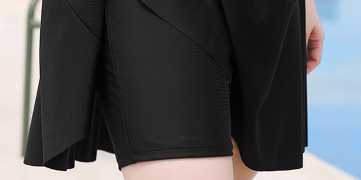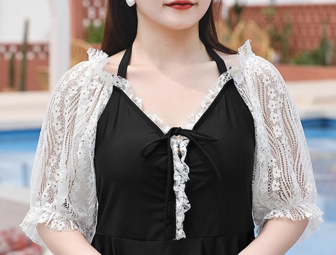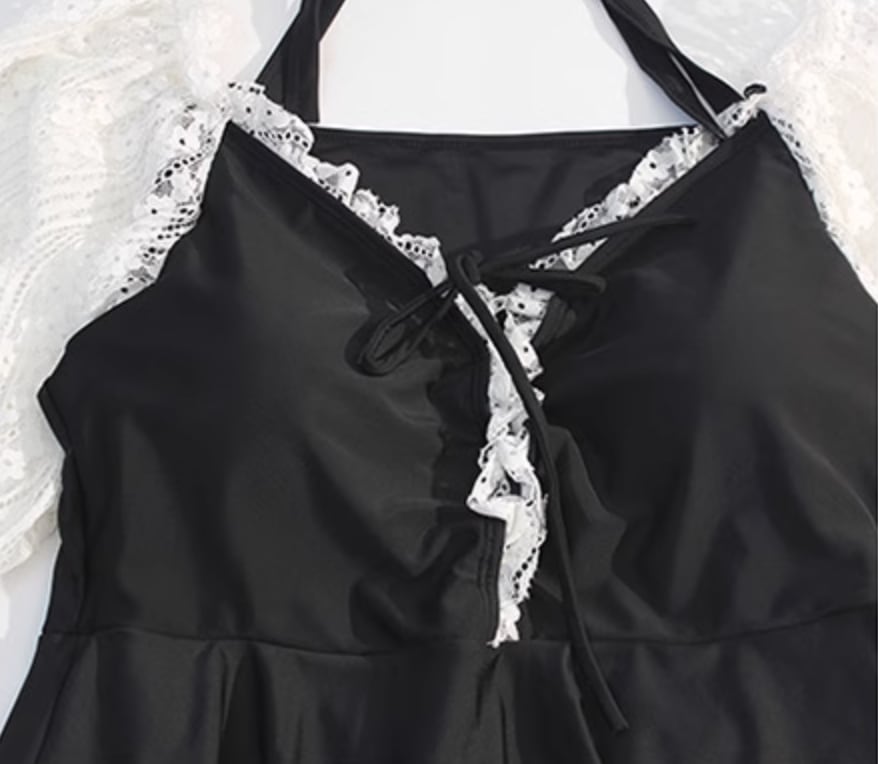 黒のワンピースタイプの水着と透け感のある羽織りとのセット!