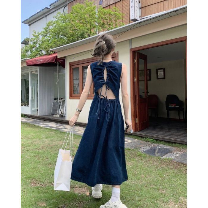 ワンピース ロング丈ワンピース デニム ノースリーブ ラウンドネック ゆる ゆったり ロング バックシャン 春 夏 プルオーバー 無地 レディース 襟なし スリム Aライン かわいい 大人可愛い シンプル こなれ感 ラフ ガーリー ルーズ 抜け感 キュート ナチュラル お出かけ リゾート 旅行 海 ビーチ 公園 休日 ショッピング コーデ 楽ちん 体型カバー 普段使い 着回し モテ トレンド S M L