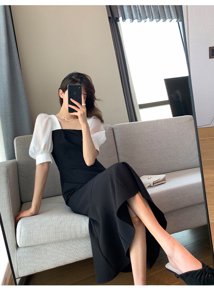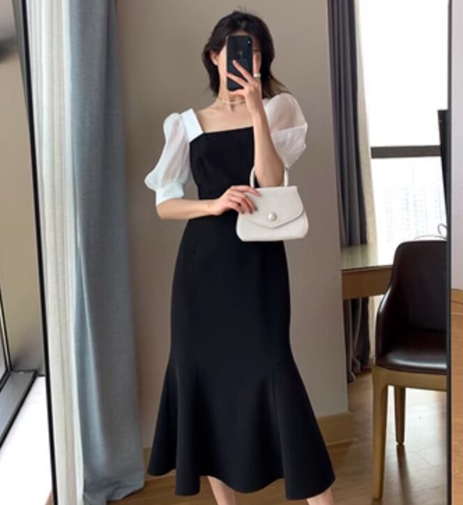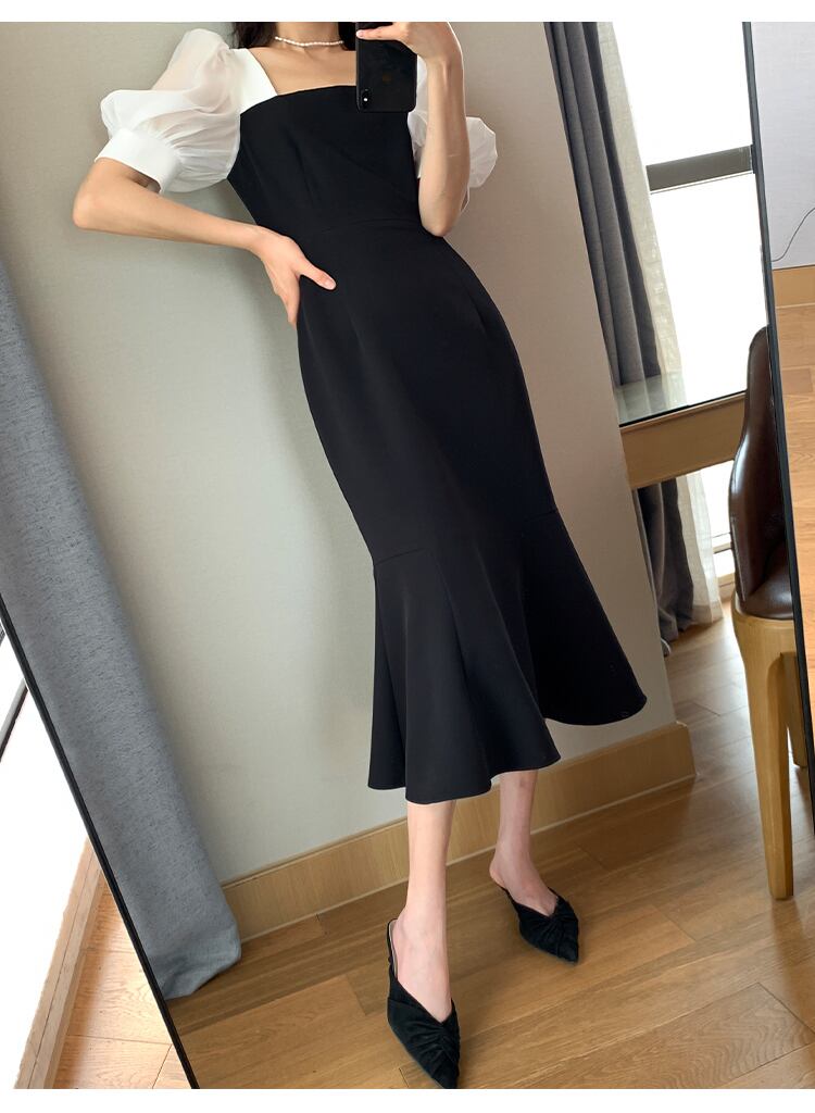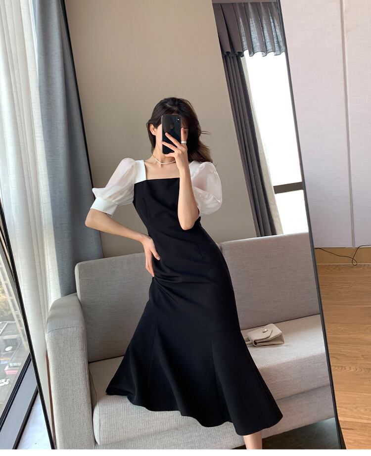 個性的 レディース ワンピース フレアスカート フレアワンピース ワンピドレス ミモレ ミモレ丈 袖あり 半袖 パフスリーブ フレアスリーブ セミフレア スリム タイト 切り替えデザイン ファスナー ポリエステル 異素材MIX 大人可愛い シンプル 大人 上品 おしゃれ お洒落 大人女子 こなれ感 セクシー エレガント 主役級 存在感 フォーマル 抜け感 無地 春 夏 二次会 20代 30代 パーティー イベント レストラン 普段使い モテ インスタ映え S M L XL 白 ホワイト 黒 ブラック