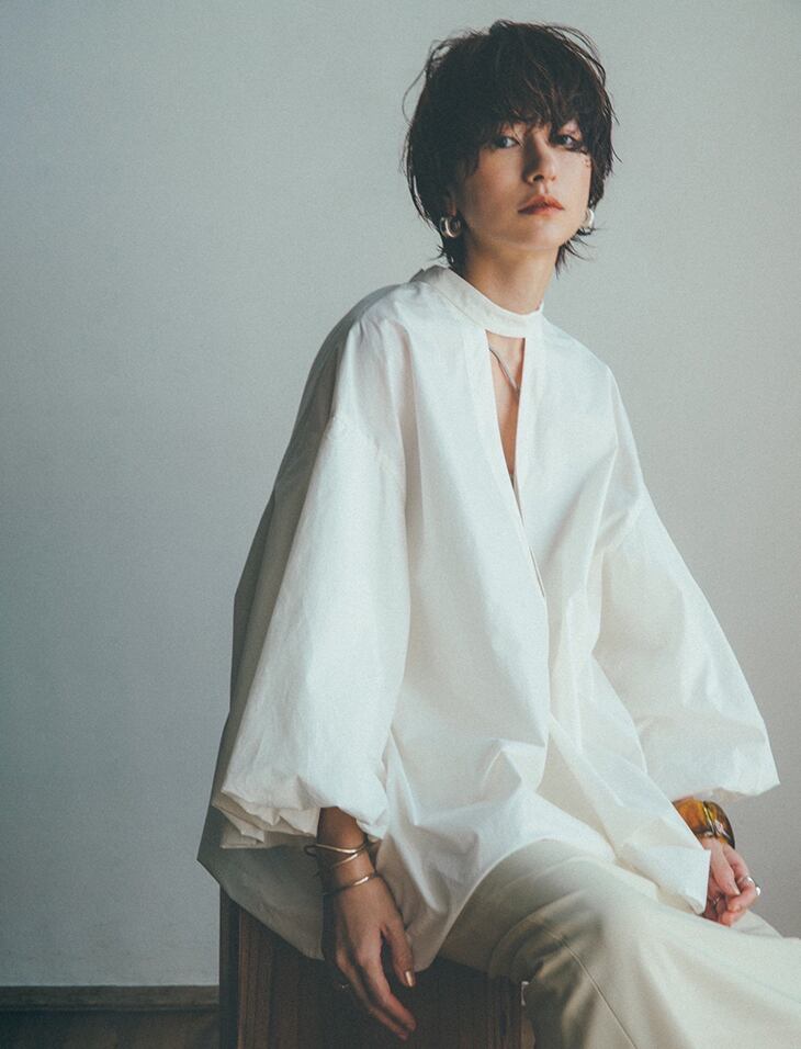 個性的なデザインが魅力のレディーストップスです。万能なアイテムで、ボリュームのあるパフスリーブが女性らしさを引き立てます。セミフレアのシルエットが上品な印象を与えます。