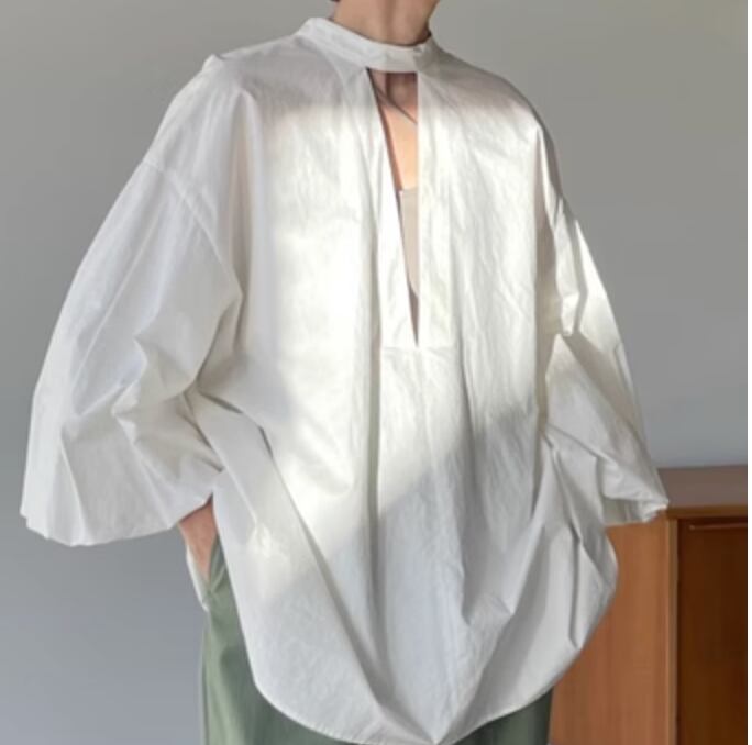 個性的 レディース トップス シャツ ブラウス 膝上 袖あり 長袖 ボリューム袖 パフスリーブ 萌袖 ラウンドネック セミフレア ワイド シフォン 前開き 綿 かわいい 大人可愛い きれいめ シンプル カジュアル 上品 オシャレこなれ感 着回し ビジネス オフィス 通勤 学生 デート お出かけ 楽ちん スタイル モテ 体型カバー 無地 S M 白 ホワイト 黒 ブラック