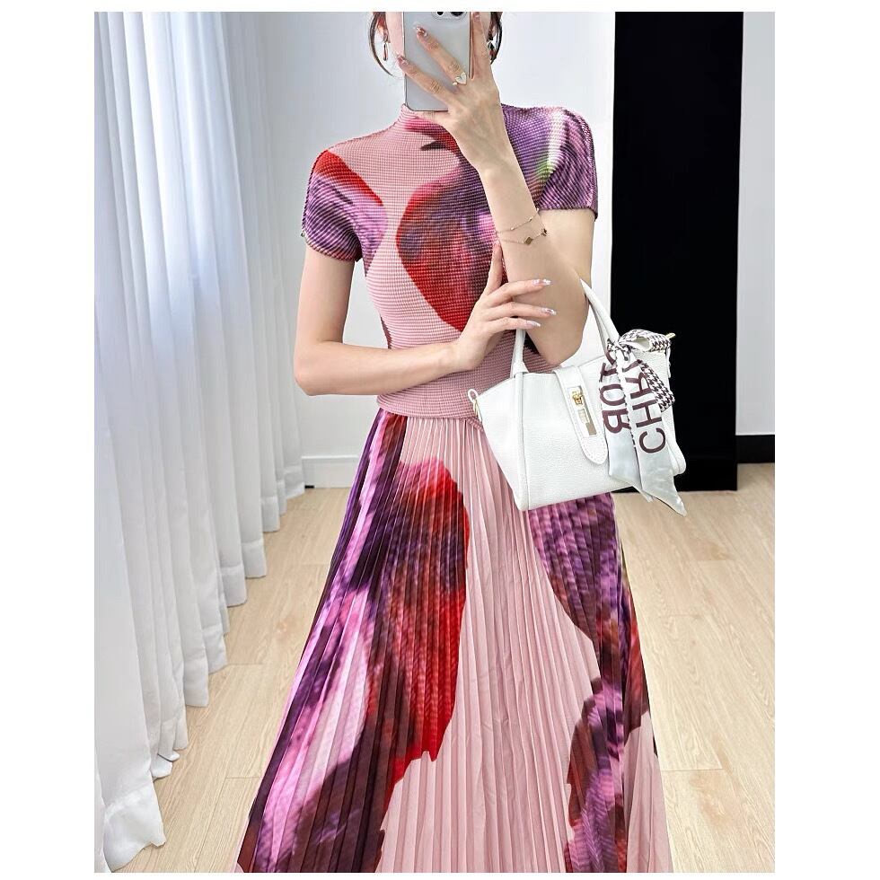 2点セット トップス スカート セットアップ Tシャツ ロングスカート プリーツスカート 袖あり 半袖 Aライン プリーツ 上下セット ツーピース 柄 花柄 フラワー きれいめ 大人 上品 おしゃれ お洒落 大人女子 エレガント 春 夏 20代 30代 40代 50代 レディース 女性用 デート お出かけ 女子会 休日 リゾート 旅行 ショッピング 着回し 普段使い 韓国 韓国系 オルチャン ファッション コーデ スタイル インスタ映え 高見え ワンホン 色展開 ピンク サイズ フリーサイズ ワンサイズ
