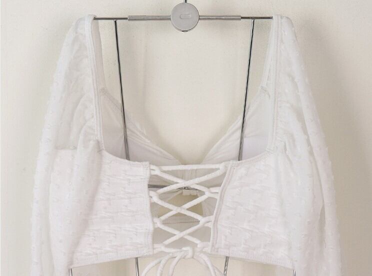 シースルーのパフスリーブとハイウエストのデザインが特徴的な水着。長袖仕様でありながら、肌見せ効果もあり、大人可愛い雰囲気を演出します。さらに、パッド付きのバスト部分で胸をキレイにボリュームアップさせることができます。自分らしいスタイルを表現しながら、体型カバーも叶えることができる一着です。