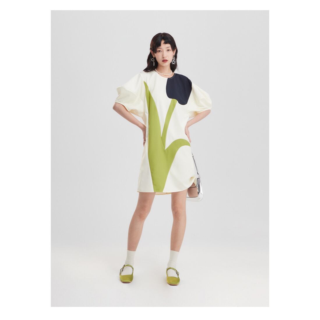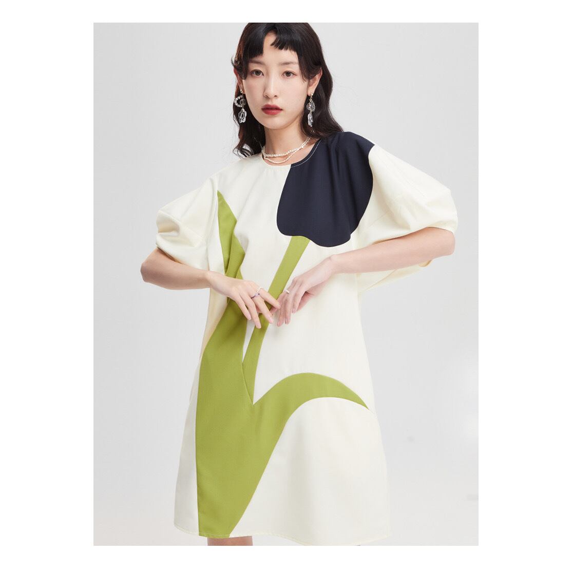 インパクトのあるミニ丈のワンピース。