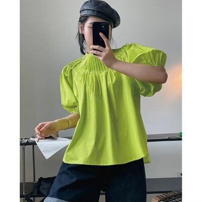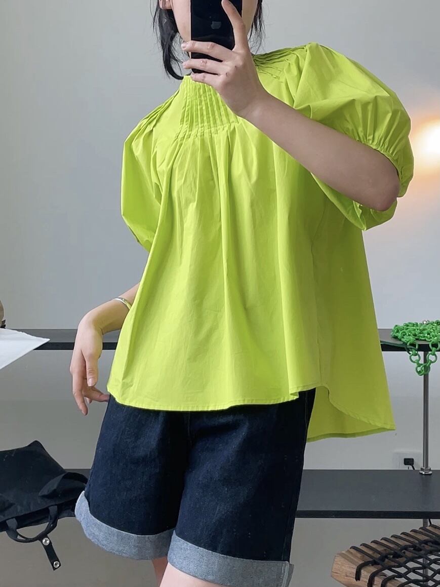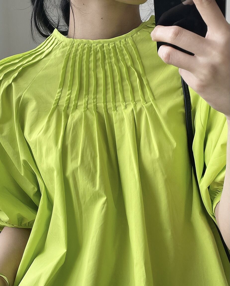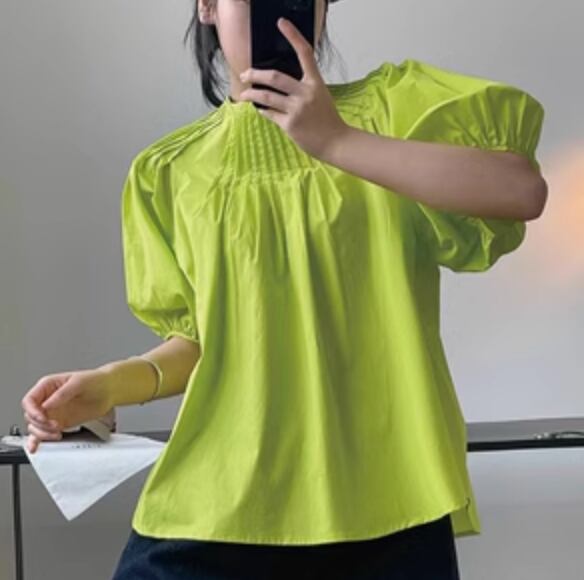 個性的 レディース トップス シャツ ブラウス ショート ショート丈 袖あり 半袖 パフスリーブ ラウンドネック フレア セミフレア ワイド プリーツ チュール 綿 かわいい おしゃれ お洒落 大人可愛い 大人女子 こなれ感 ラブリー キュート クール モード系 エレガント 主役級 存在感 抜け感 無地 春 夏 10代 20代 女性用 学生 デート お出かけ 女子会 お泊まり 休日 ホテル レストラン ファッション 楽ちん 体系カバー トレンド 流行 インスタ映え ゆったり ゆる 緑 グリーン 春カラー