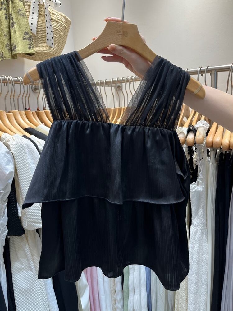 大人ガーリーなノースリーブトップス。レディースにぴったりなリボン付きトップスの。Vネックデザインで女性らしさを引き立て、フェミニンな印象を与えます。シースルーデザインが大人の可愛らしさを演出。シンプルながらも、フリルやリボンのディテールが上品なアクセントとなり、カジュアルからきれいめまで様々なスタイリングにピッタリです。