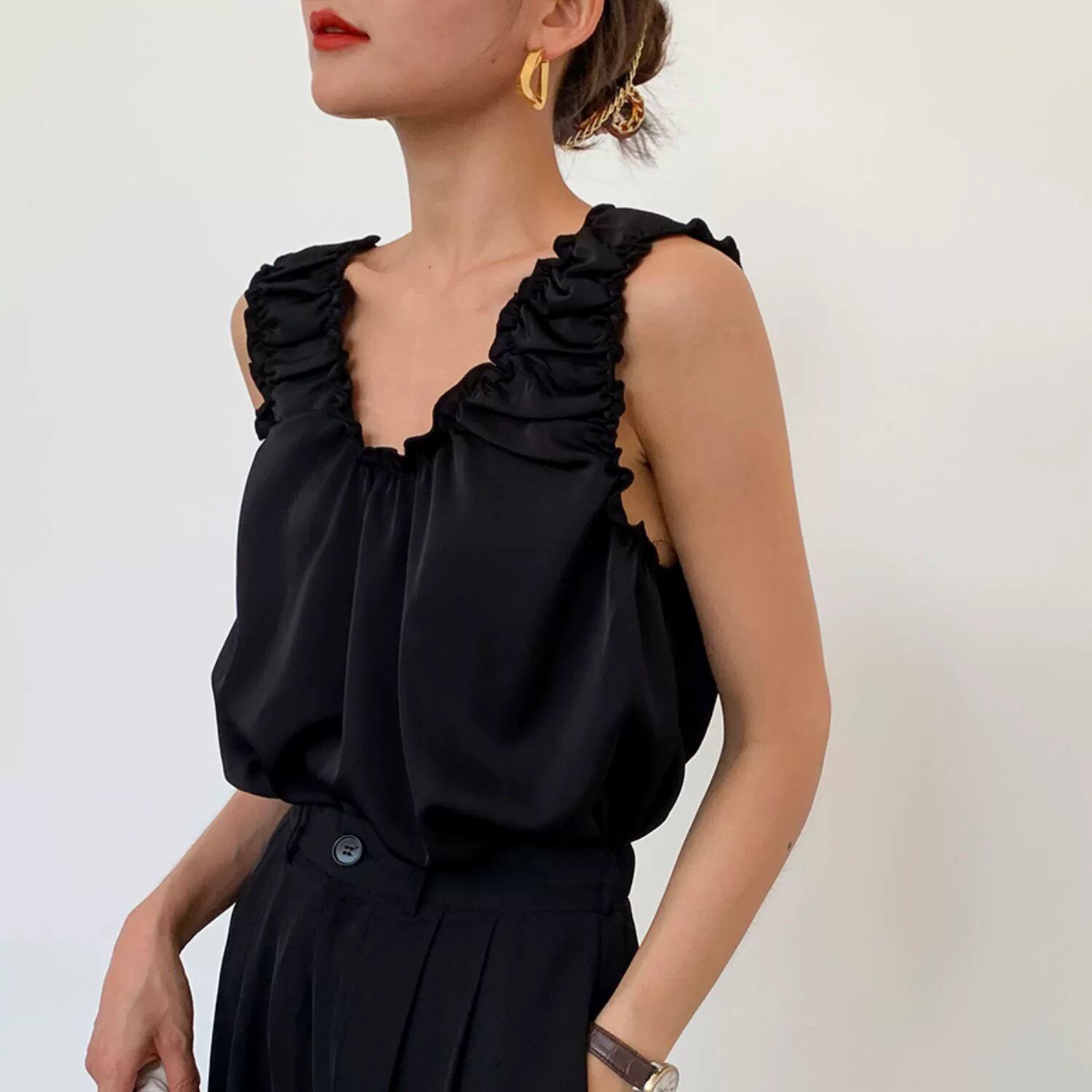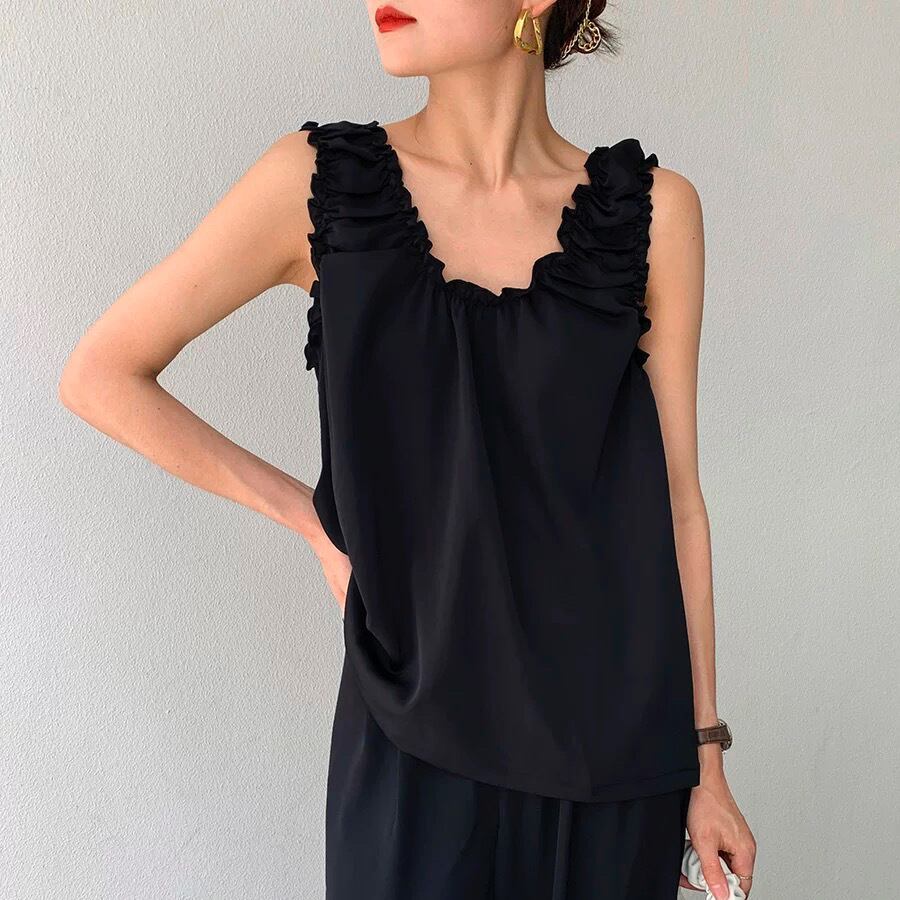 ギャザーフリルがオシャレなバックレスのノースリーブトップス