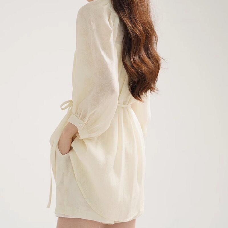 レディース シャツ キャミソール セットアップ ショートパンツ 長袖 ラウンドネック シフォン ウエストリボン ボタン 薄手 かわいい 大人可愛い きれいめ シンプル カジュアル 上品 おしゃれ こなれ感 ラフ ガーリー ルーズ 個性的 とろみ感 抜け感 ラブリー キュート ナチュラル 花柄 夏 OL 学生 デート お出かけ お泊まり パーティー イベント リゾート 旅行 海 プール ビーチ 女子会 休日 バカンス コンサート ライブ 楽ちん プレゼント 3点セット XS S M L アプリコット
