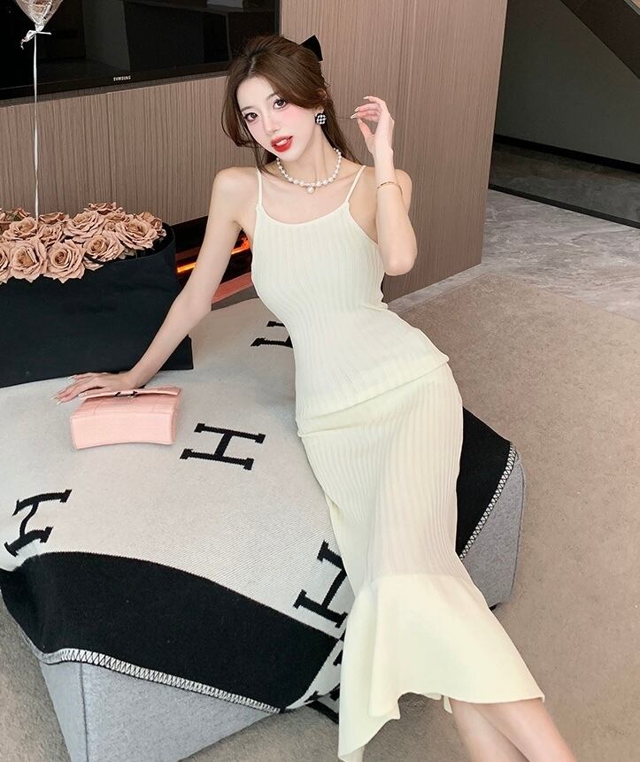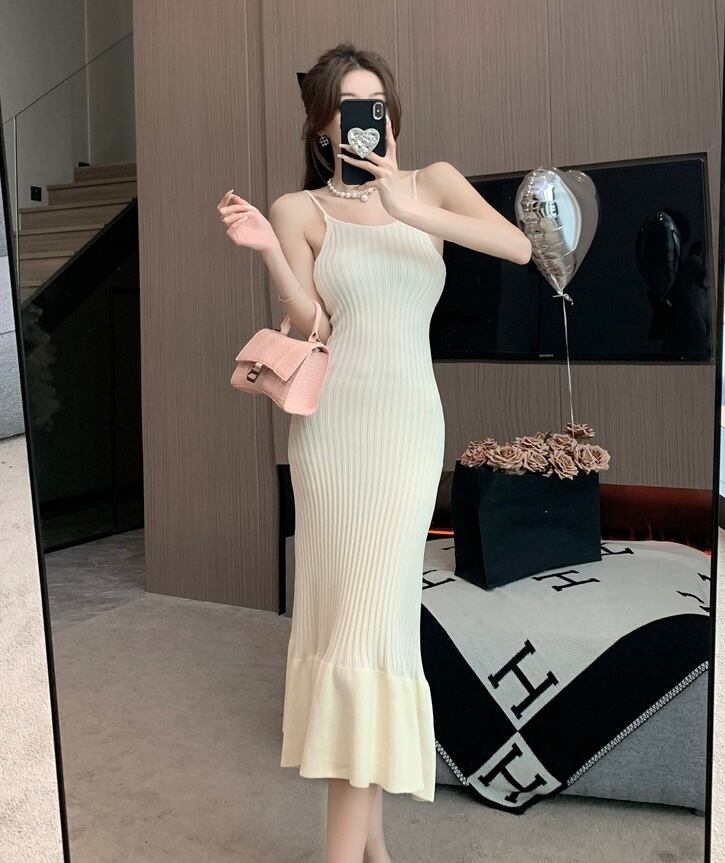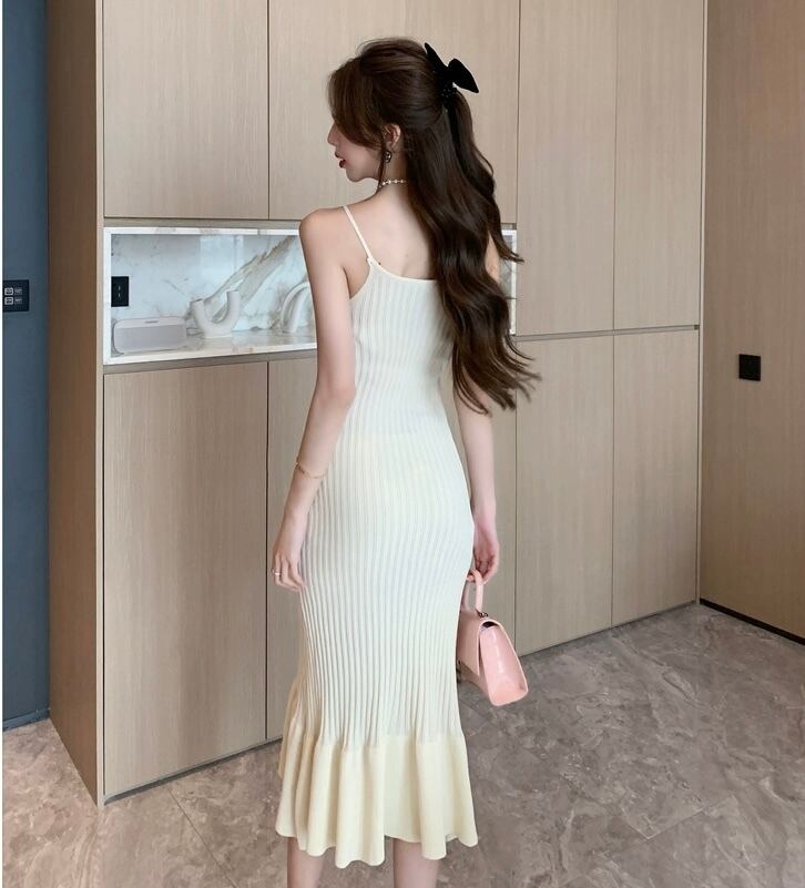 ワンピース ワンピドレス ミモレ丈 袖なし ノースリーブ 襟なし サスペンダー スリム 細身 マーメイド フリル プルオーバー 薄手 大人可愛い きれいめ シンプル カジュアル 大人 上品 お洒落 かっこいい レトロ 大人女子 こなれ感 クール モード系 セクシー エレガント モダン 主役級 存在感 とろみ感 抜け感 無地 夏 10代 20代 レディース デート お出かけ 女子会 パーティー イベント 韓国系 オルチャン ファッション モテ トレンド 流行 インスタ映え S M L アプリコット ブラック