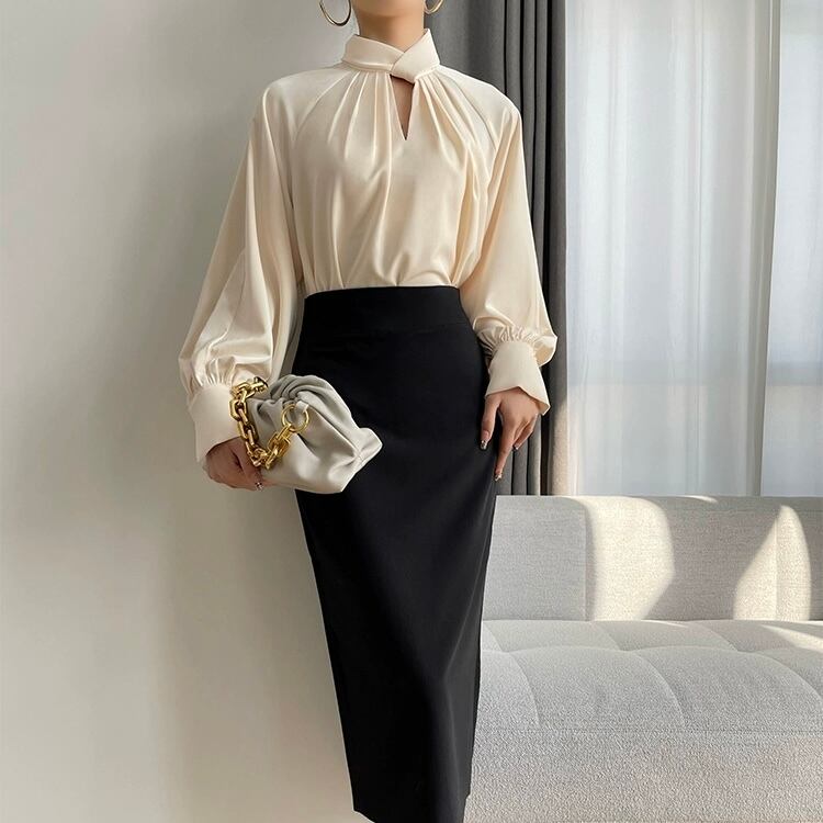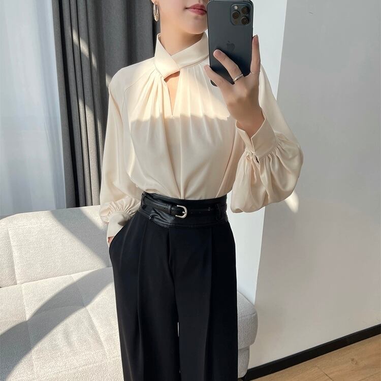 トレンド感満載の大人可愛いシャツブラウスです。Vネックとスリムなシルエットが女性らしさを引き立て、上品でお洒落な印象を与えます。さらに、薄手のサテン素材が華やかさを演出し、レトロな雰囲気も醸し出します。この一枚で簡単にこなれ感を演出でき、主役級の存在感もあります。無地のシンプルなデザインなので、さまざまなコーディネートに合わせやすく、フォーマルな場からカジュアルなデートまで幅広く活躍します。秋のお出かけやパーティー、イベント、ホテルやレストランでの特別な場面にもぴったりです。