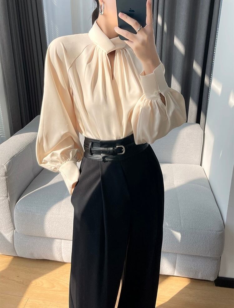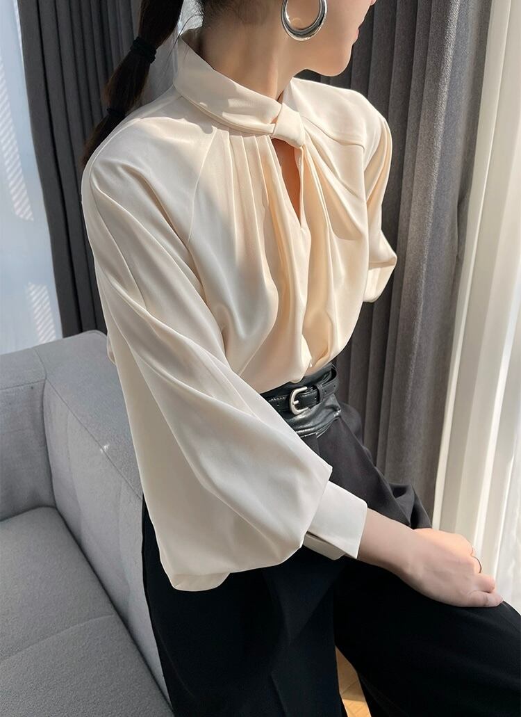 トップス シャツ ブラウス レギュラー丈 袖あり 長袖 ランタンスリーブ Vネック スリム 細身 ストレート プルオーバー 薄手 サテン 大人可愛い きれいめ シンプル 大人 上品 お洒落 かっこいい レトロ 大人女子 こなれ感 クール モード系 セクシー エレガント モダン 主役級 存在感 フォーマル とろみ感 抜け感 無地 秋 20代 30代 40代 レディース お出かけ パーティー イベント ホテル レストラン 韓国系 オルチャン コーデ モテ トレンド 流行 インスタ映え S M L アプリコット