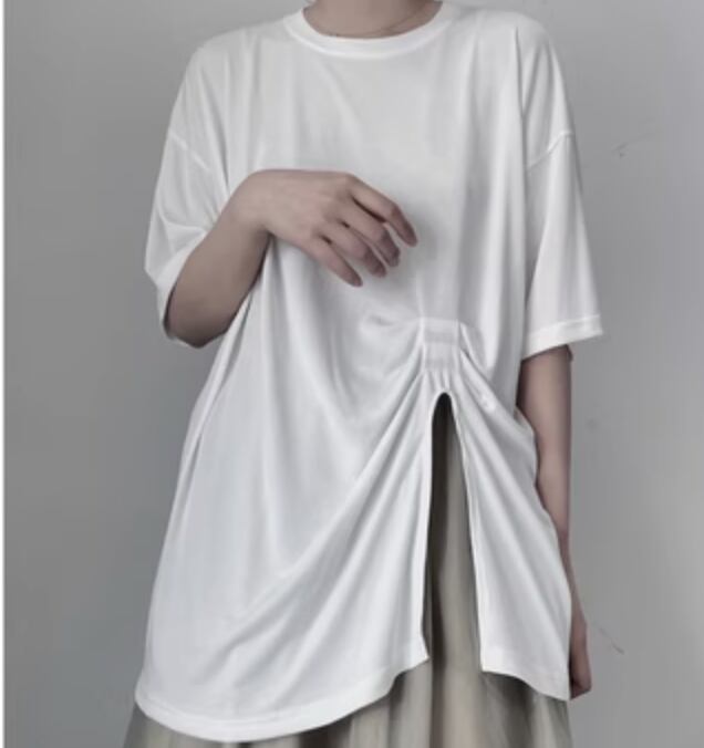 裾のスリットが特徴的な大人可愛いデザインのTシャツです!さまざまなスタイルに合わせやすいく、シンプルで上品なカラーです。