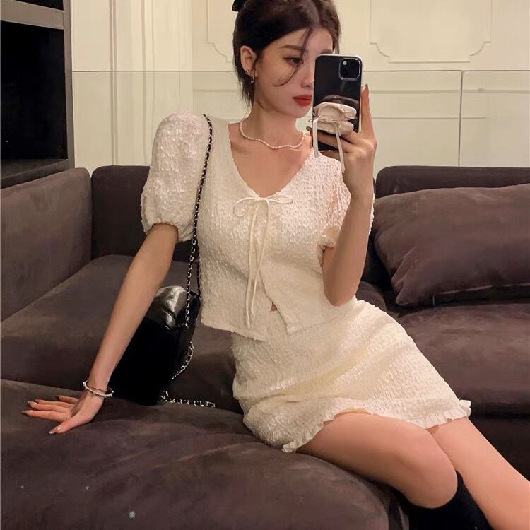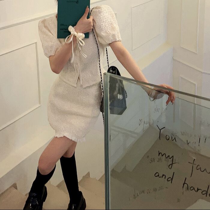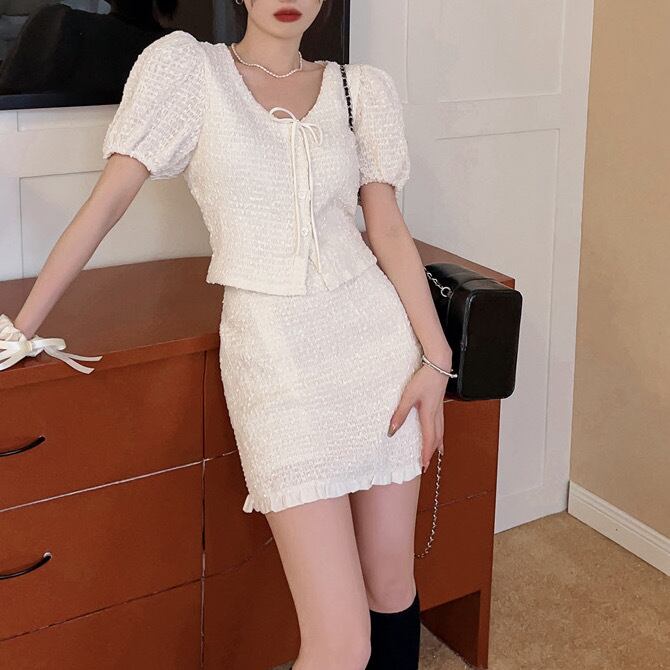 2点セット トップス スカート ボトムス セットアップ ミニ ミニ丈 半袖 パフスリーブ Vネック リボン スリム タイト ハイウエスト 上下セット ツーピース 無地 かわいい 大人可愛い シンプル カジュアル おしゃれ お洒落 オトナ可愛い キュート ガーリー フェアリー フェミニン 春 夏 10代 20代 30代 レディース 女性用 デート お出かけ 女子会 休日 ショッピング 着回し 普段使い 韓国 韓国系 オルチャン ファッション コーデ スタイル モテ ワンホン 白 ホワイト サイズ展開 S M