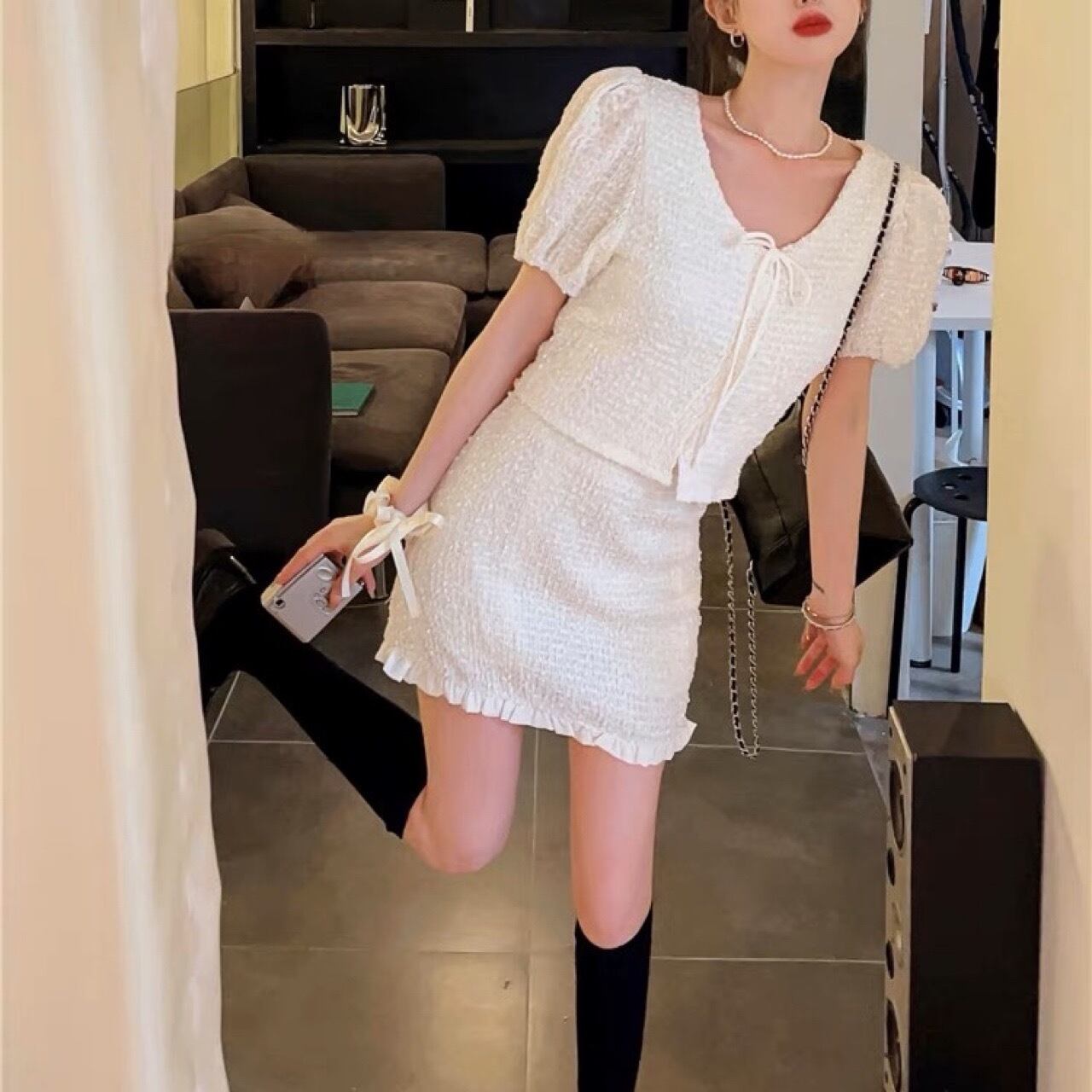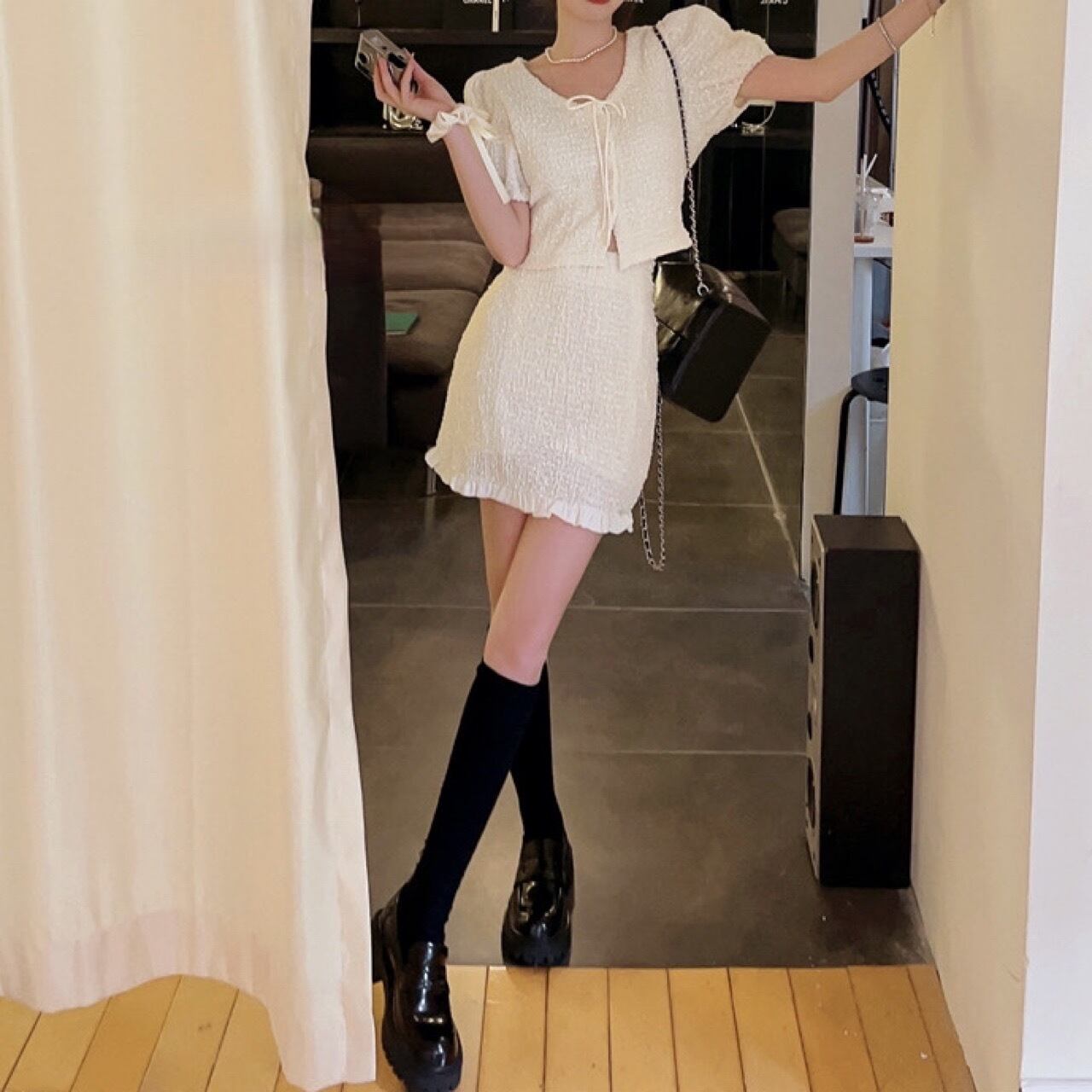 クロップド丈のパフスリーブトップスとミニスカートの2点セット