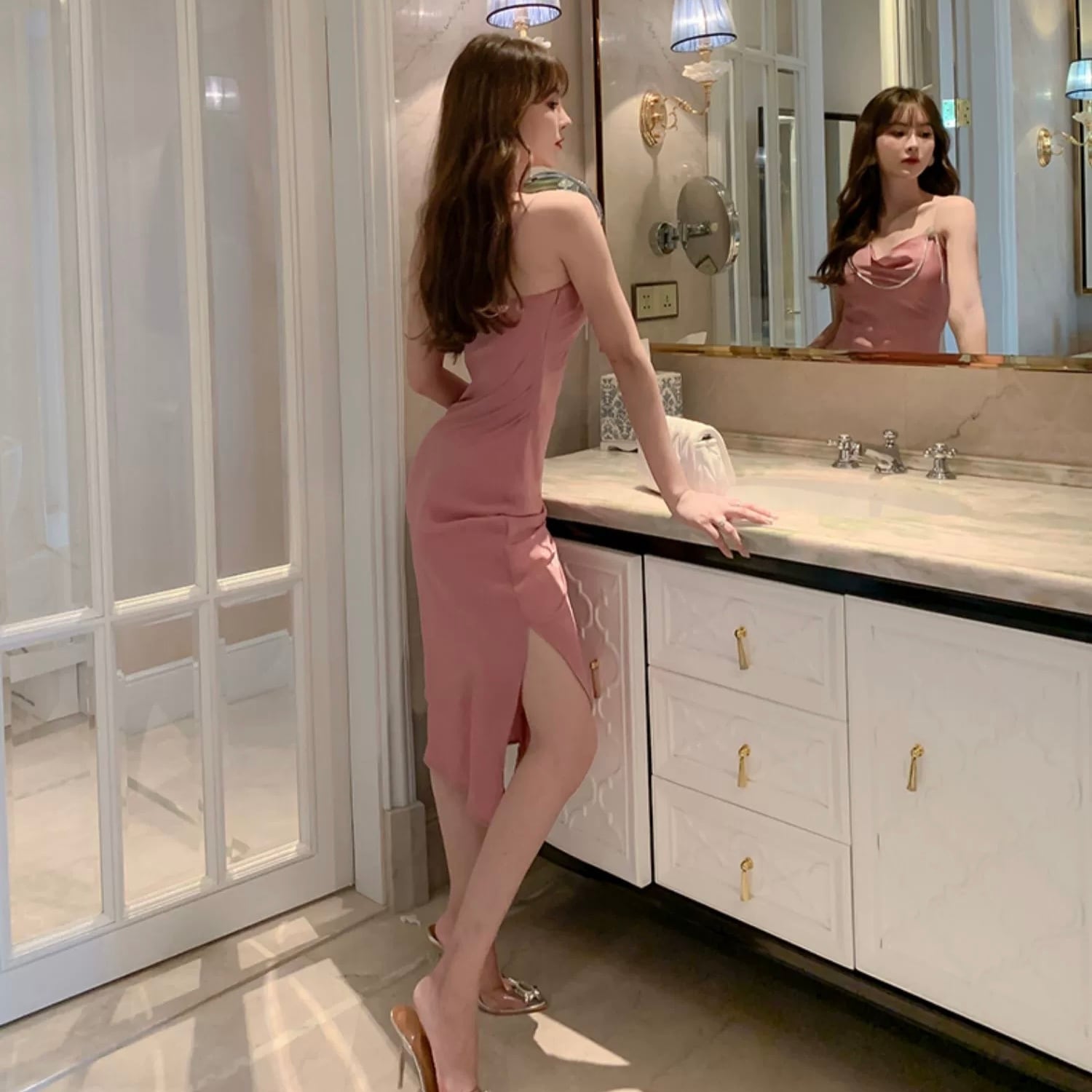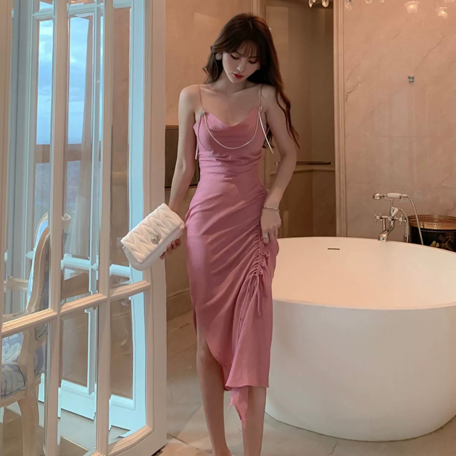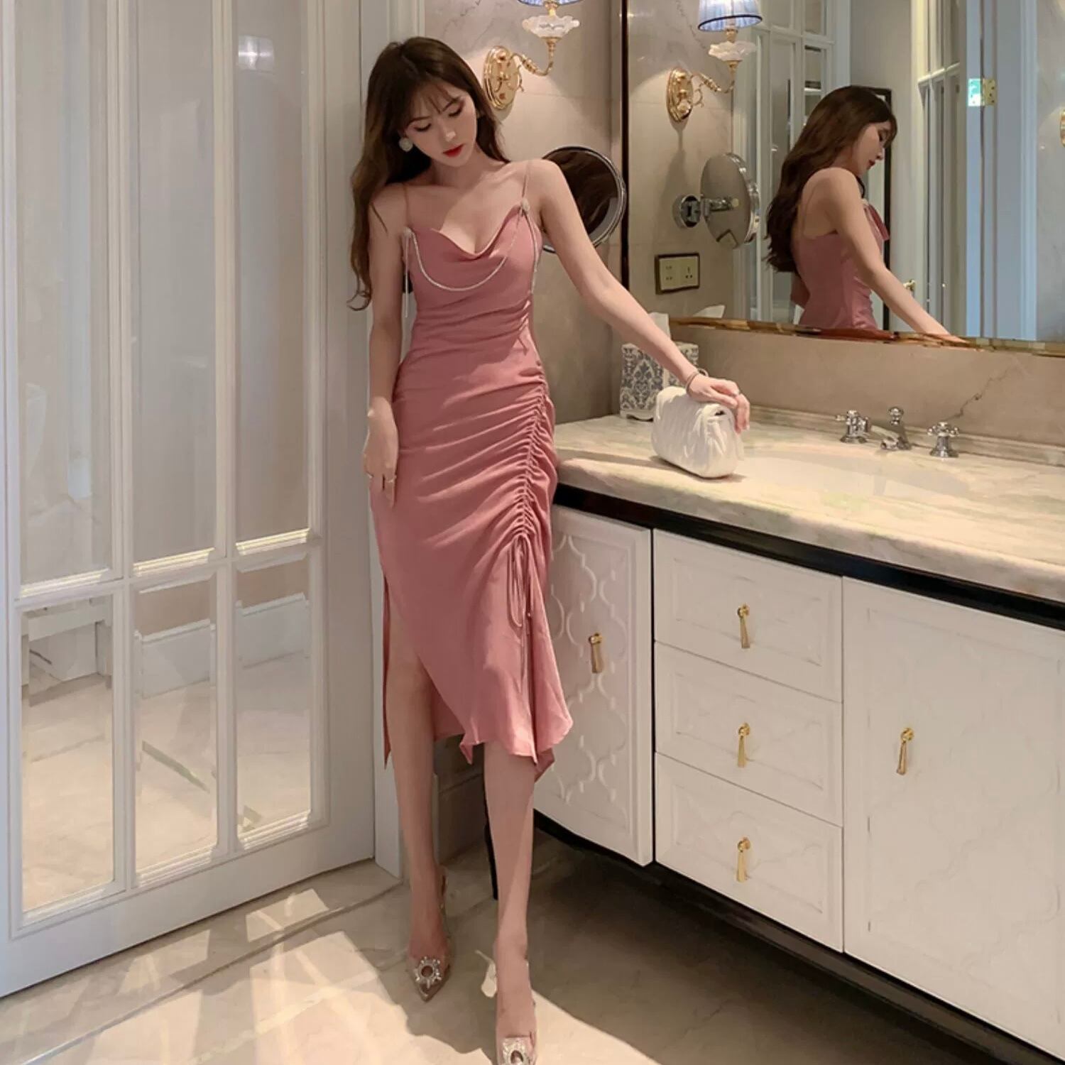ドレス パーティードレス ミモレ丈ドレス イブニングドレス ミモレ丈 袖なし ノースリーブ タイト スリム 細身 スリット サイドスリット ハイウエスト シャーリング 胸元 谷間 ポリエステル 大人可愛い きれいめ 大人 上品 お洒落 かっこいい レトロ 大人女子 こなれ感 クール モード系 セクシー エレガント 主役級 華やか スタイリッシュ 無地 20代 30代 40代 レディース 韓国系 オルチャン 美脚 脚長 高見え 格上げ 夏 結婚式 二次会 披露宴 お呼ばれ パーティー S M L ピンク