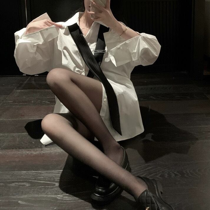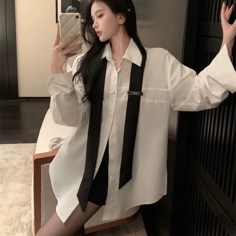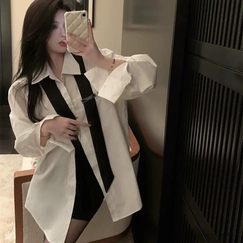 2点セット トップス シャツ 白シャツ ロング ロング丈 袖あり ネクタイ タイ 長袖 ポロカラー ワイド 無地 大人可愛い シンプル カジュアル おしゃれ お洒落 かっこいい オトナ可愛い ラフ メンズライク ボーイッシュ ルーズ セクシー 色っぽ 春 秋 10代 20代 30代 40代 レディース 女性用 デート お出かけ 女子会 休日 ショッピング 着回し 普段使い 韓国 韓国系 オルチャン ファッション コーデ スタイル インスタ映え 白 ホワイト サイズ S M L XL 大きめ ゆったり ゆる