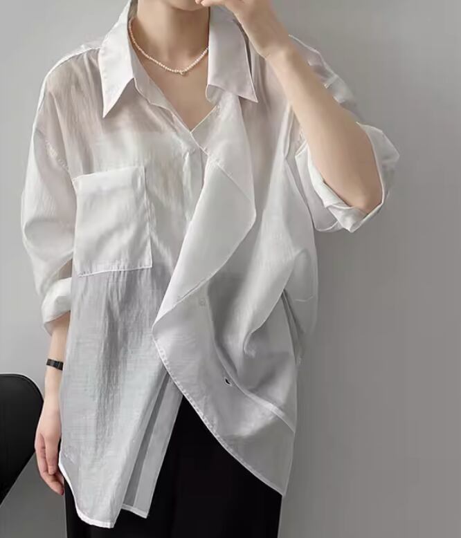 透け感のある涼しげな印象を与えるレディースブラウスです。フレアなシルエットで、女性らしさを引き立てます。オフィスやデート、レストランなどさまざまな場面で活躍します。