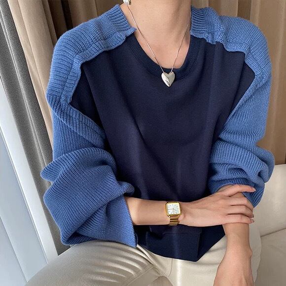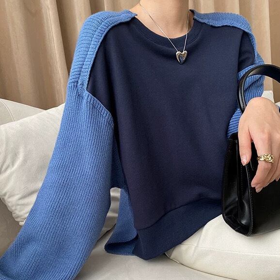 トップス プルオーバー トレーナー 袖あり 長袖 ラウンドネック 切り替えデザイン 異素材 無地 大人可愛い シンプル カジュアル 大人 おしゃれ お洒落 かっこいい こなれ感 ラフ 萌え袖 メンズライク ルーズ 抜け感 秋 冬 10代 20代 30代 40代 レディース 女性用 デート お出かけ 女子会 休日 ショッピング 公園 着回し 普段使い 韓国 韓国系 オルチャン ファッション コーデ コーディネート スタイル インスタ映え 高見え 色展開 青 ブルー サイズ S M L XL ゆる ゆったり
