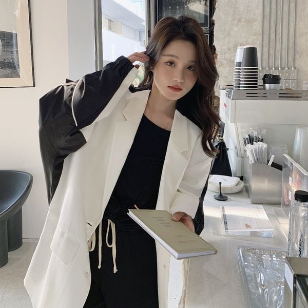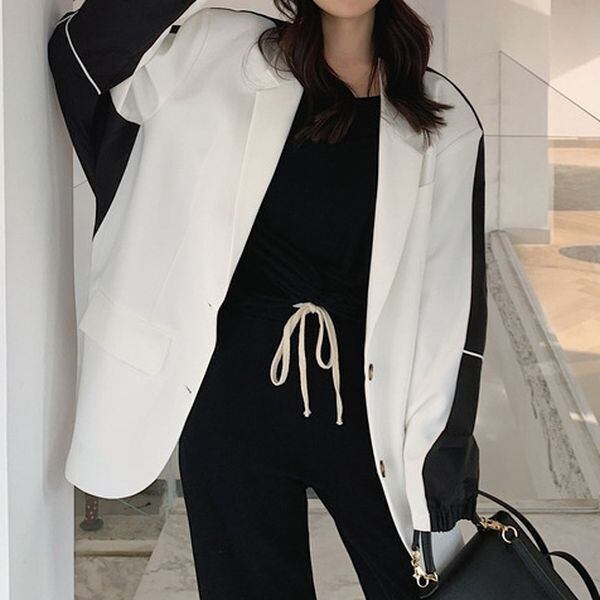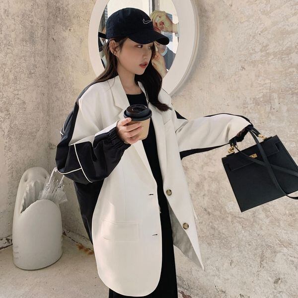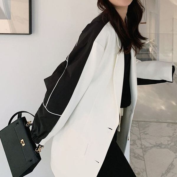 個性的 レディース アウター ジャケット オーバーサイズ ビッグシルエット 袖あり 長袖 襟付き ポケット 前開き きれいめ 大人女子 こなれ感 メンズライク ボーイッシュ クール エレガント 主役級 フォーマル バイカラー モノトーン 秋 冬 20代 30代 ビジネス 学生 通学 パーティー イベント リクルート レストラン 普段使い 重ね着 お洒落 スタイル 楽ちん 体系カバー インスタ映え S M L ゆったり 黒 ブラック