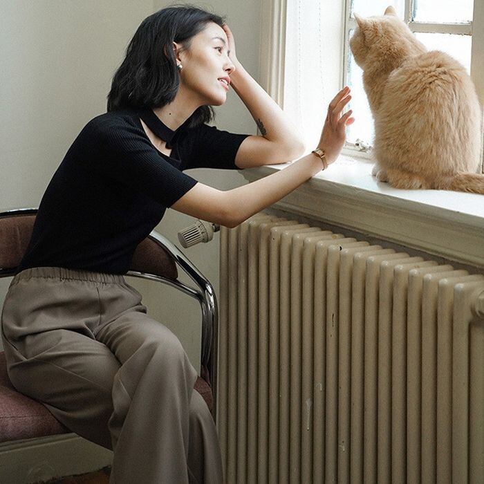 お洒落度をぐっと上げるリブニットのトップスです。