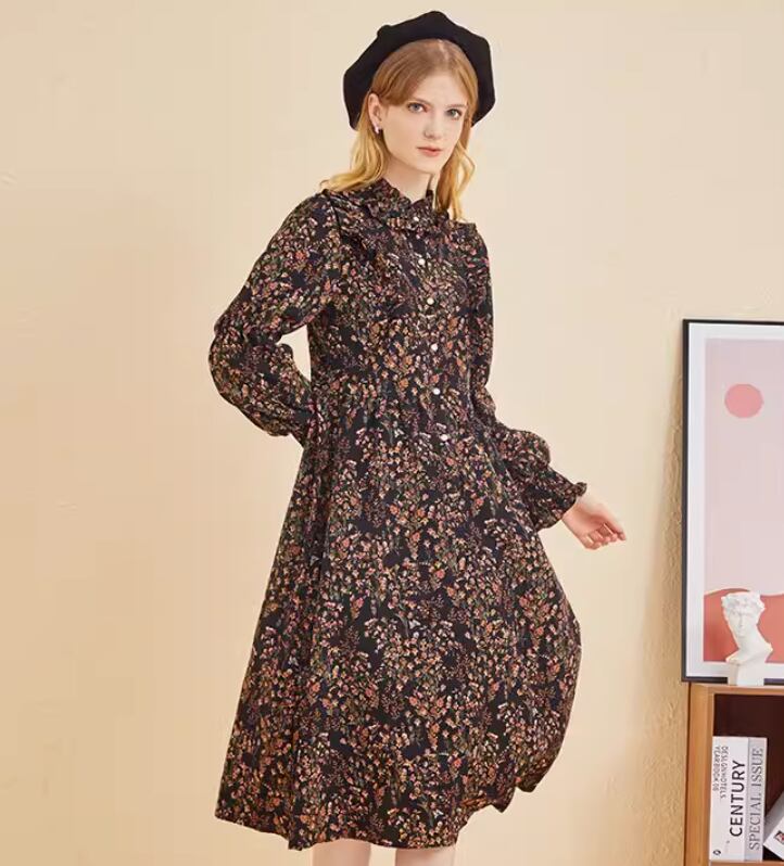 レディース スカート ワンピース オールインワン フレアワンピース ワンピドレス ミモレ ミモレ丈 袖あり 長袖 ボリューム袖 パフスリーブ フレアスリーブ セミフレア プリーツ 刺繍 シフォン フリル ポリエステル かわいい 大人可愛い きれいめ 大人 上品 おしゃれ お洒落 エレガント 主役級 柄 花柄 小花柄 春 秋 冬 10代 20代 学生 通学 デート お出かけ 女子会 パーティー イベント 普段使い 韓国系モテ 楽ちん 体系カバー 定番 インスタ映え S M L 黒 ブラック 茶色 ブラウン