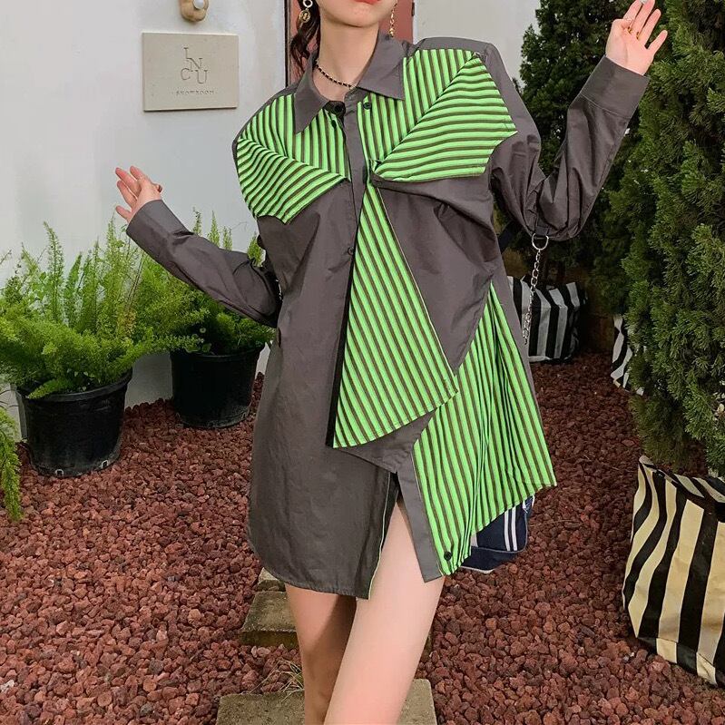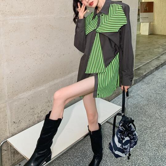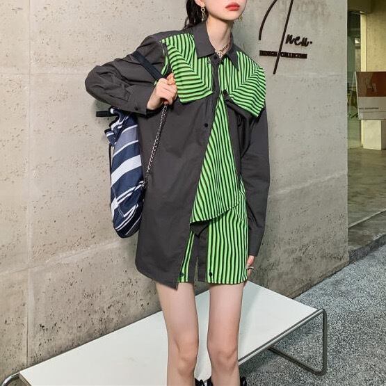 トップス ジャケット シャツ 袖あり 長袖 Vネック ポロカラー 切り替えデザイン 無地 柄 ストライプ 大人 おしゃれ お洒落 かっこいい メンズライク マニッシュ ボーイッシュ 個性的 クール モード系 主役級 存在感 秋 冬 衣装 10代 20代 30代 40代 レディース 女性用 デート お出かけ 女子会 休日 イベント ショッピング 着回し 普段使い 韓国 韓国系 オルチャン ファッション コーデ スタイル インスタ映え 色展開 緑 グリーン 灰色 グレー サイズ展開 フリーサイズ ワンサイズ
