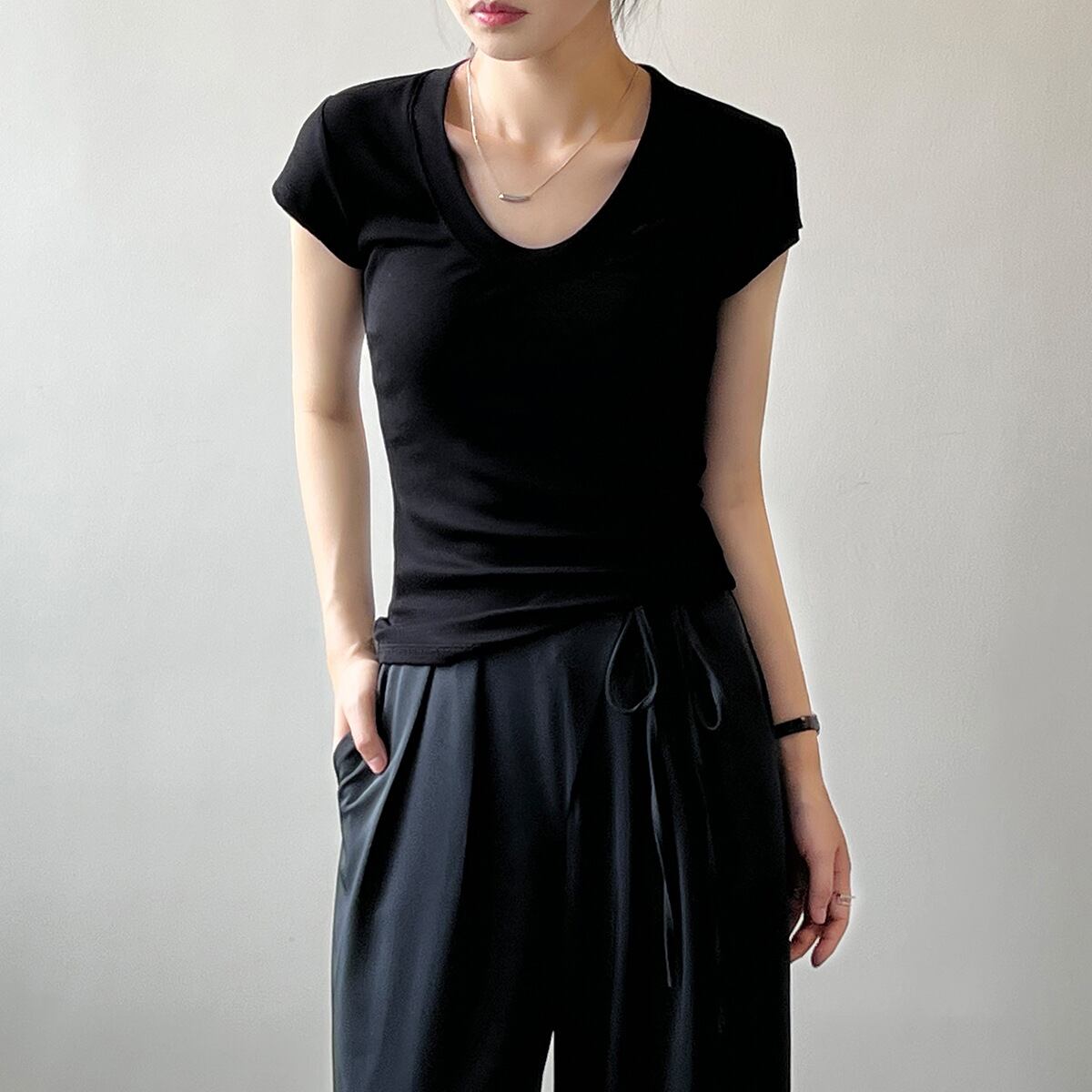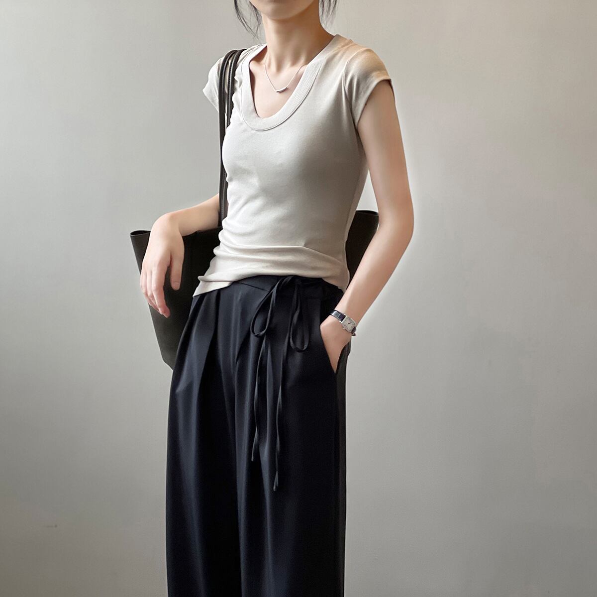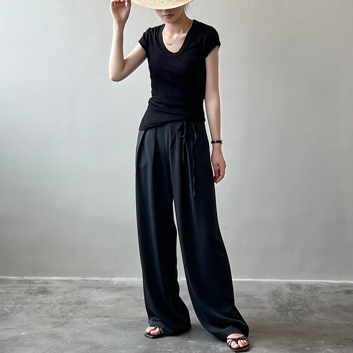 Uネックでデコルテラインを美しく見せ、スリムなシルエットでフィットしてくれるので、動きやすさもバツグン。ストレートできれいめなデザインは、カジュアルにも、きれいめにも合わせやすいアイテムです。