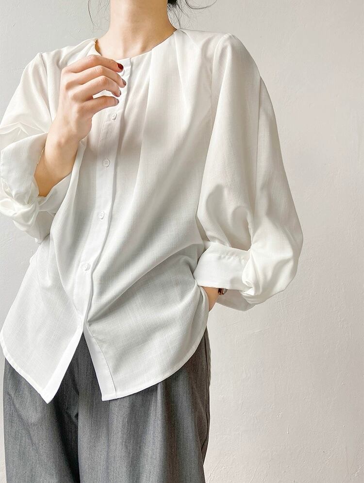 トップス シャツ レギュラー丈 袖あり 七分袖 ラウンドネック 襟なし ルーズ 前開き 薄手 大人可愛い きれいめ シンプル カジュアル 大人 上品 お洒落 かっこいい レトロ 大人可愛い 大人女子 こなれ感 ラフ クール モード系 モダン 主役級 存在感 とろみ感 抜け感 無地 春 20代 30代 40代 レディース OL 通勤 デート お出かけ 女子会 お泊まり ホテル ガーデン レストラン ショッピング 韓国系 オルチャン ファッション コーデ スタイル トレンド 流行 M L グリーン グレー
