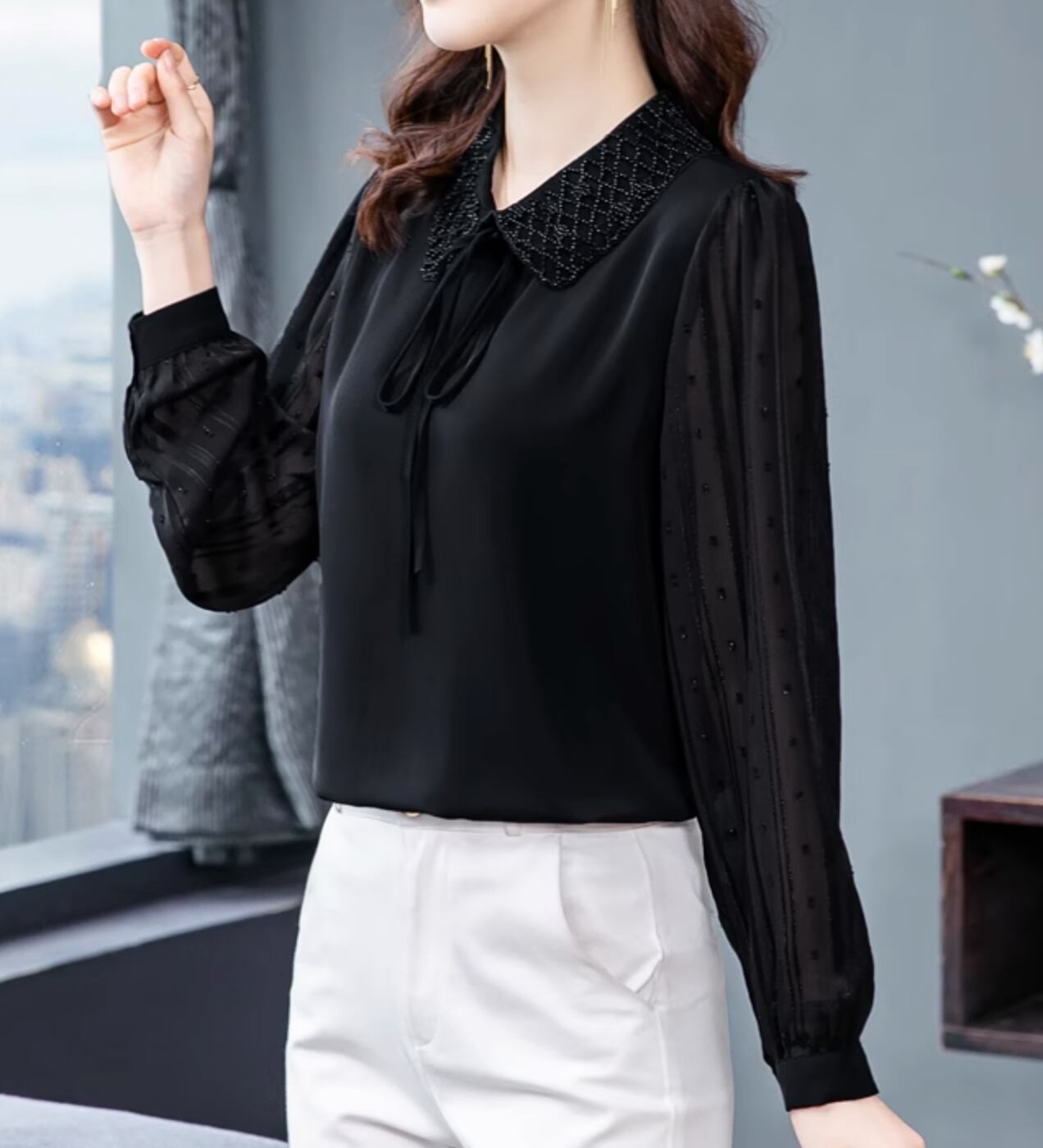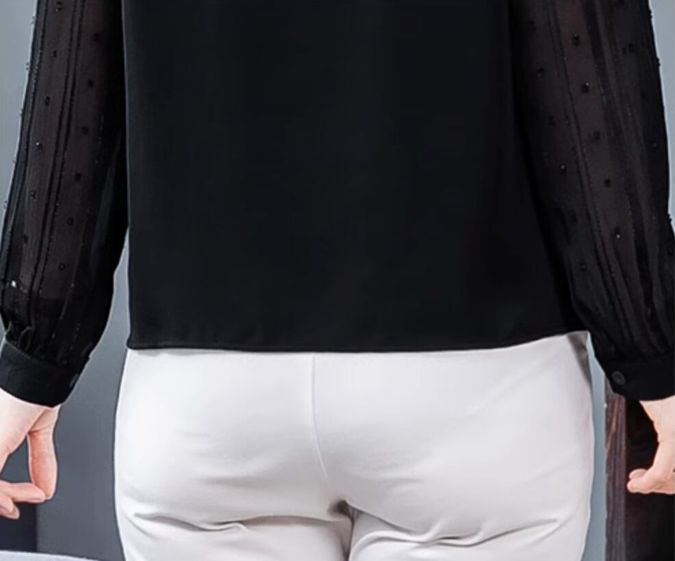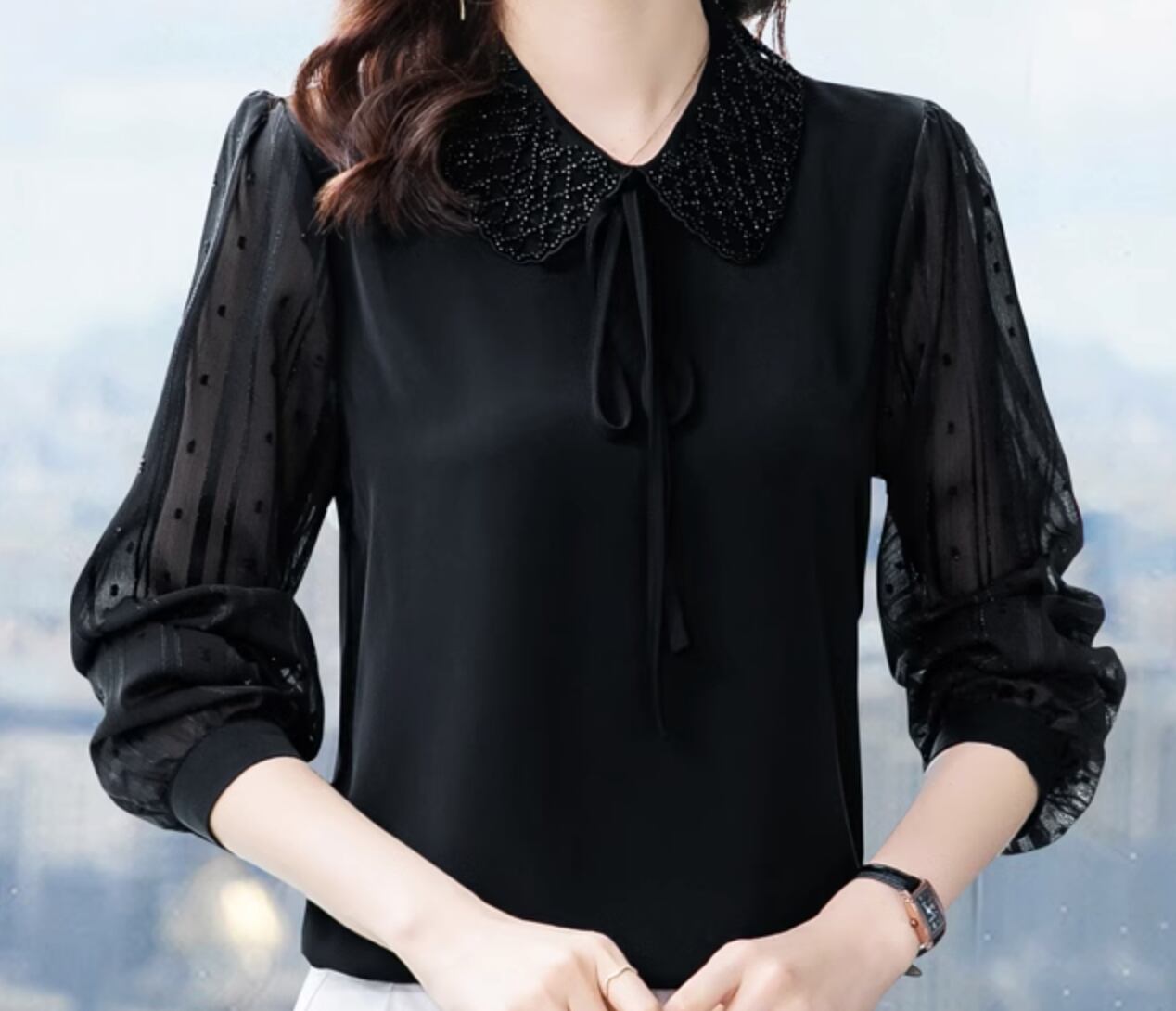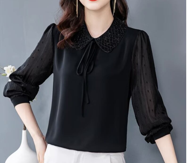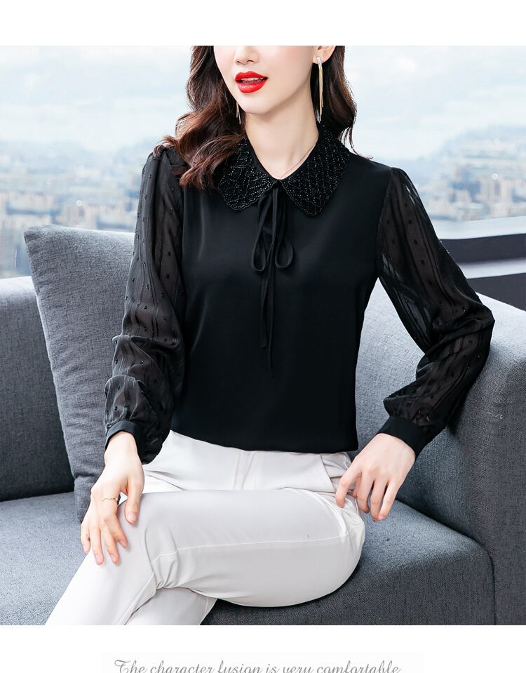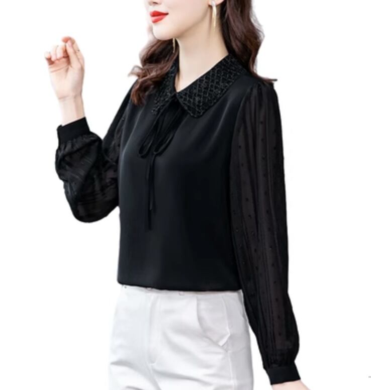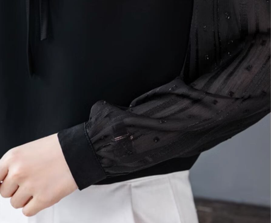 様々なシーンで活躍するレディーストップスです。ドット柄の透け感のある袖のデザインが女性らしさを引き立てます。さらに、襟付きでエレガントな雰囲気を演出します。