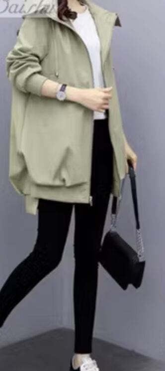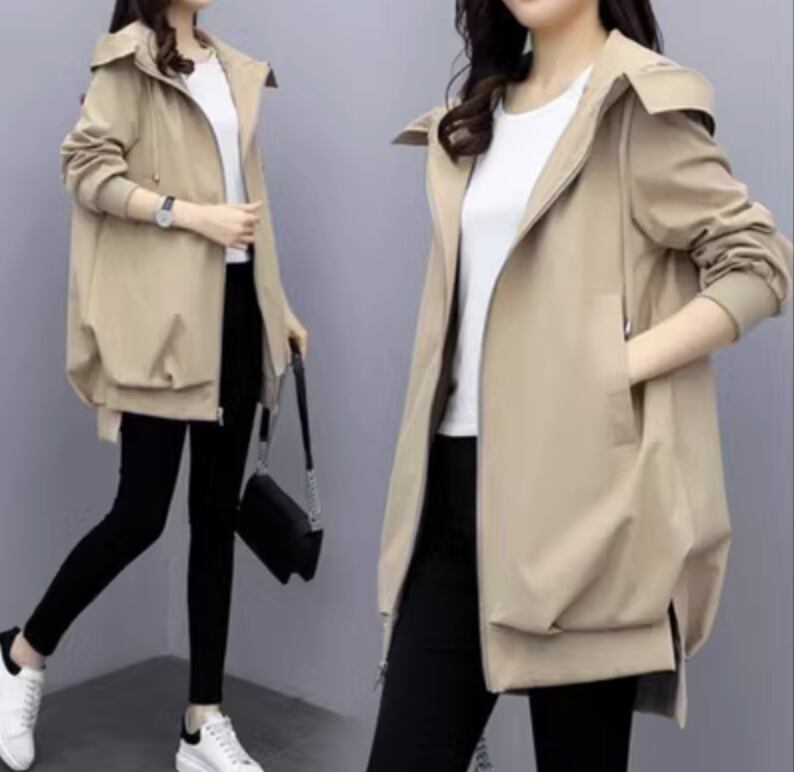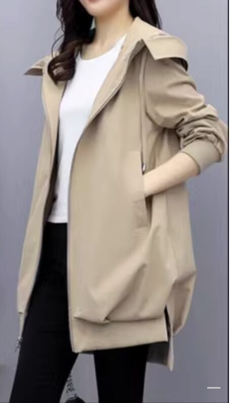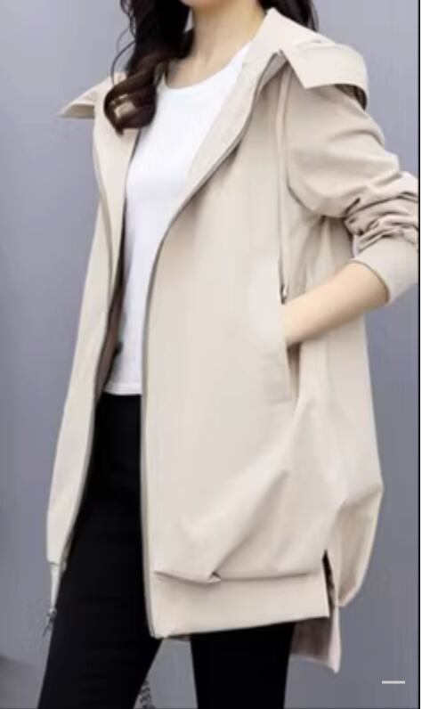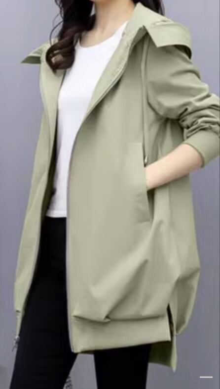 膝上丈のセミフレアAラインジャケットです。ポケットやフード、ファスナーなど、機能的でありながらもおしゃれなデザインが特徴です。カジュアルな着こなしにも、オフィスやお出かけにもぴったりなアイテムです。