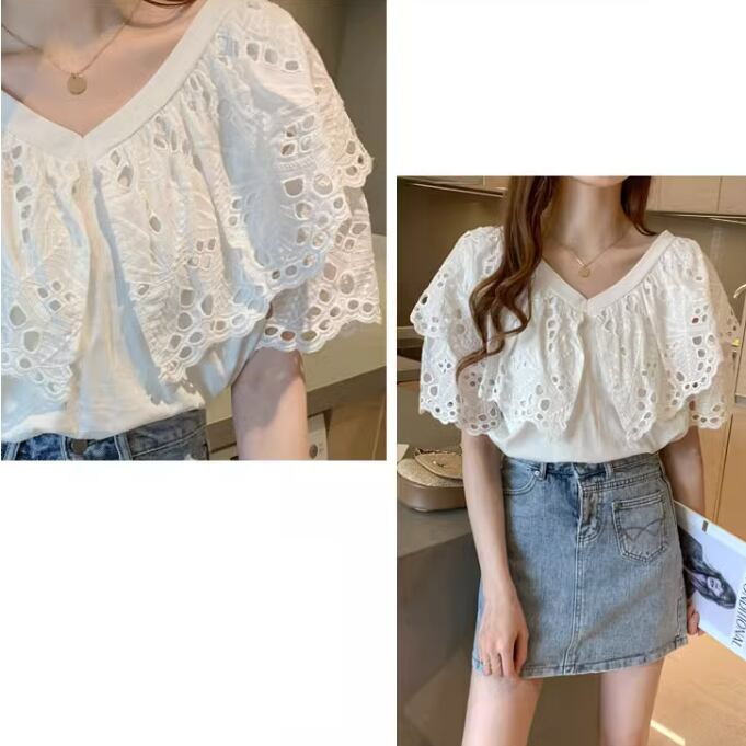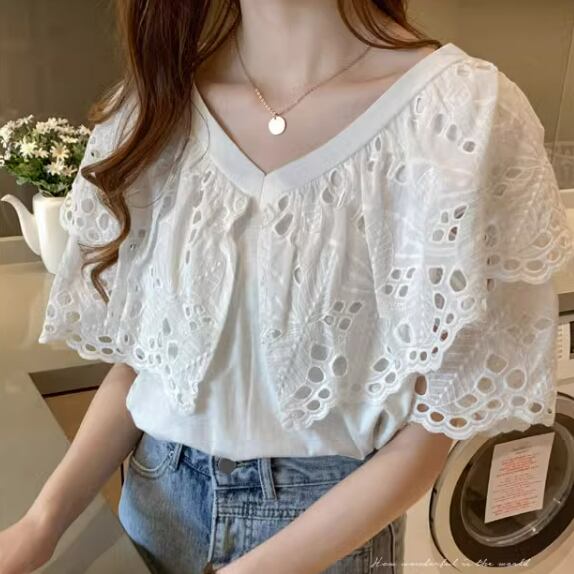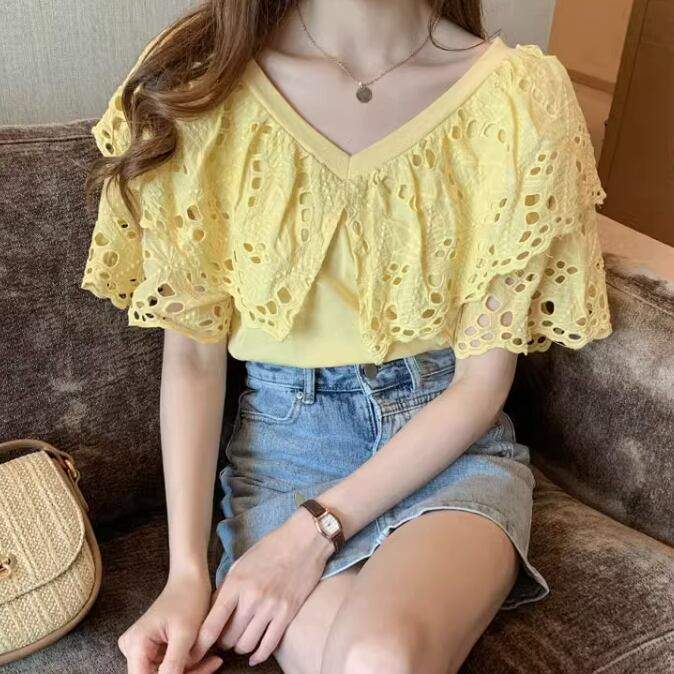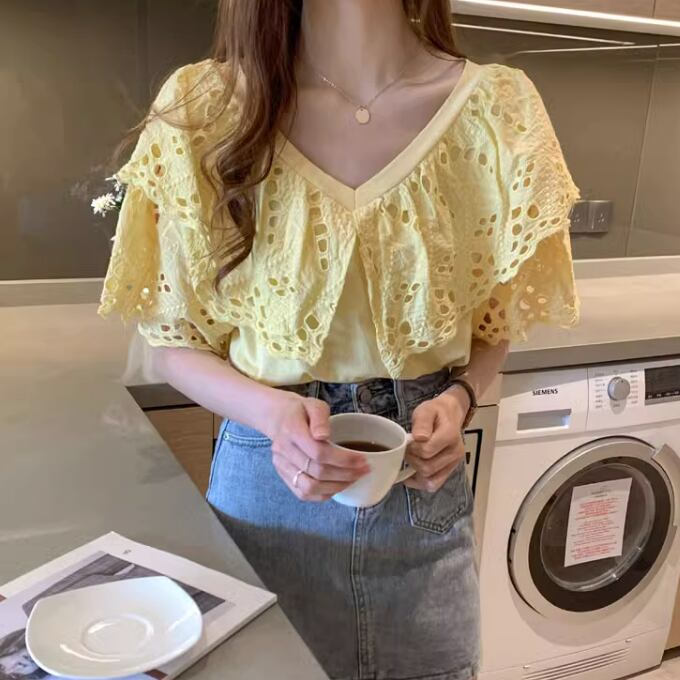 レディース トップス シャツ ブラウス 半袖 フレアスリーブ Vネック フレア フェミニン レース 刺繍 フリル かわいい 大人可愛い きれいめ シンプル カジュアル 上品 おしゃれ こなれ感 ガーリー ラブリー キュート セクシー 甘め 無地 春 夏 ママ OL 通勤 学生 通学 デート お出かけ イベント リゾート 旅行 海 レストラン 女子会 ショッピング 韓国 コーデ 楽ちん 体型カバー 普段使い 着回し モテ トレンド 流行 インスタ映え S M L XL 2XL ゆったり ホワイト イエロー