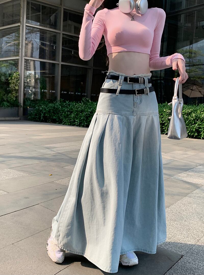 大人可愛いロングデニムスカート。ハイウエストでウエストマークできるデザインが女性らしさを引き立てます。Aラインでスッキリとしたシルエットながらも、ゆったりとした広がりが品のある印象を与えます。カジュアルなスタイリングにはもちろん、上品できれいめなスタイリングにも合わせやすいアイテムです。