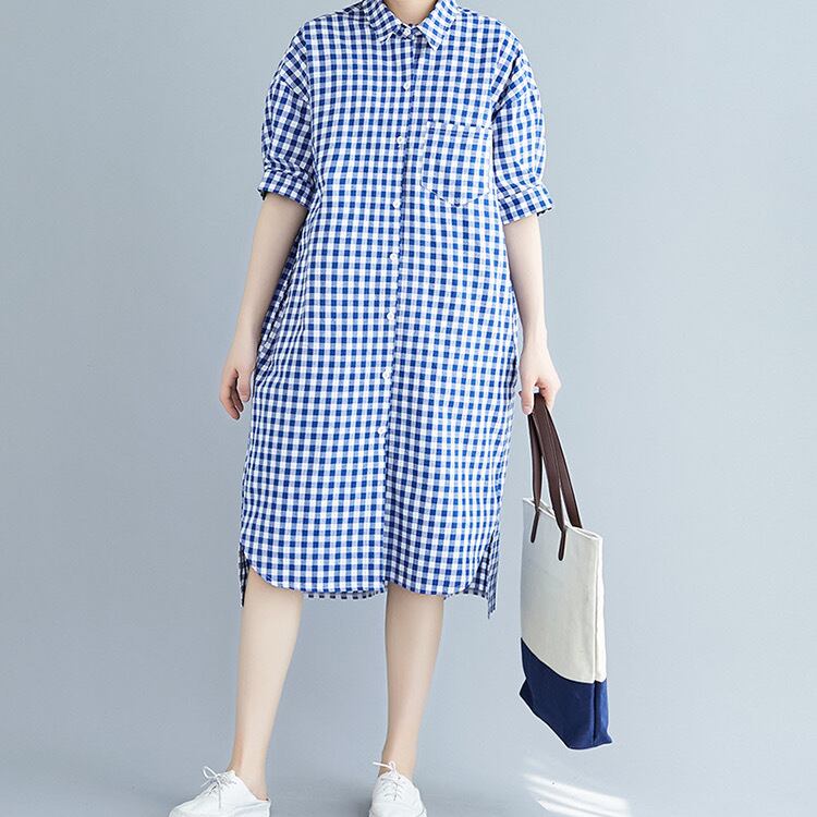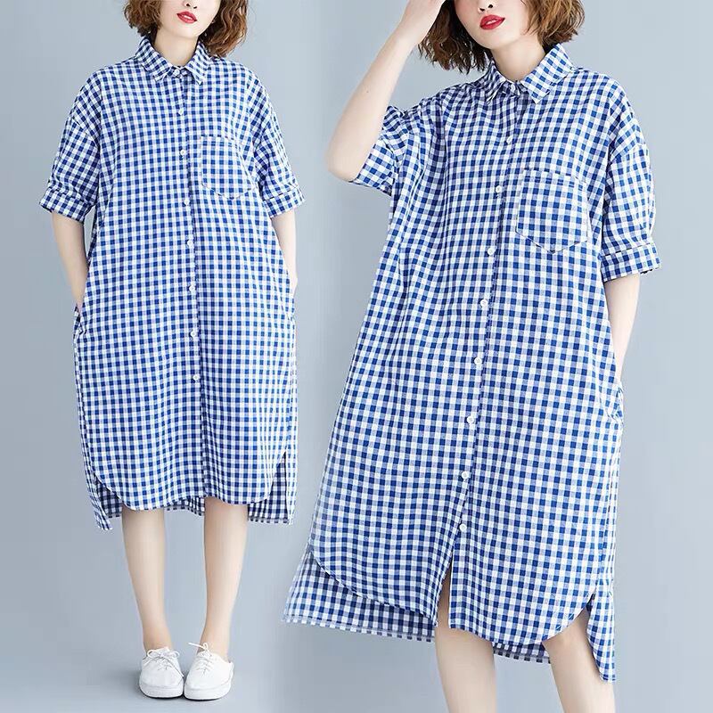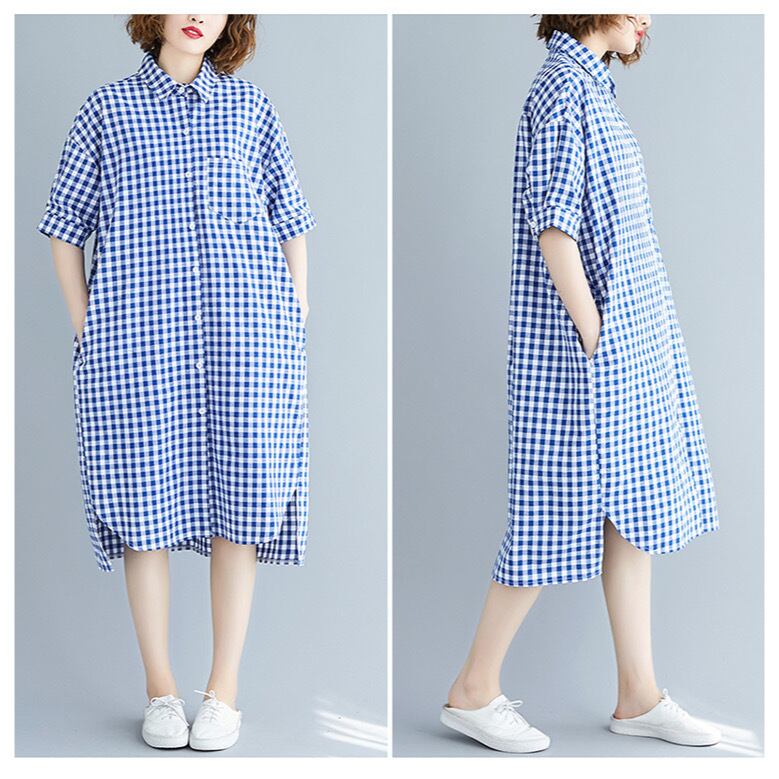 ワンピース シャツワンピース ロング ロング丈 ミディアム丈 膝下 半袖 襟付き ポロ襟 ワイド 柄 チェック柄 ボタン ポケット 胸ポケ 爽やか 涼し気 カジュアル おしゃれ お洒落 レトロ ラフ ルーズ フェミニン 清楚 春 夏 10代 20代 30代 40代 レディース 女性用 ママ デート お出かけ 女子会 休日 ショッピング 公園 普段使い 韓国 韓国系 オルチャン ファッション コーデ コーディネート スタイル デイリー 色展開 青 ブルー サイズ フリーサイズ ワンサイズ ゆる ゆったり
